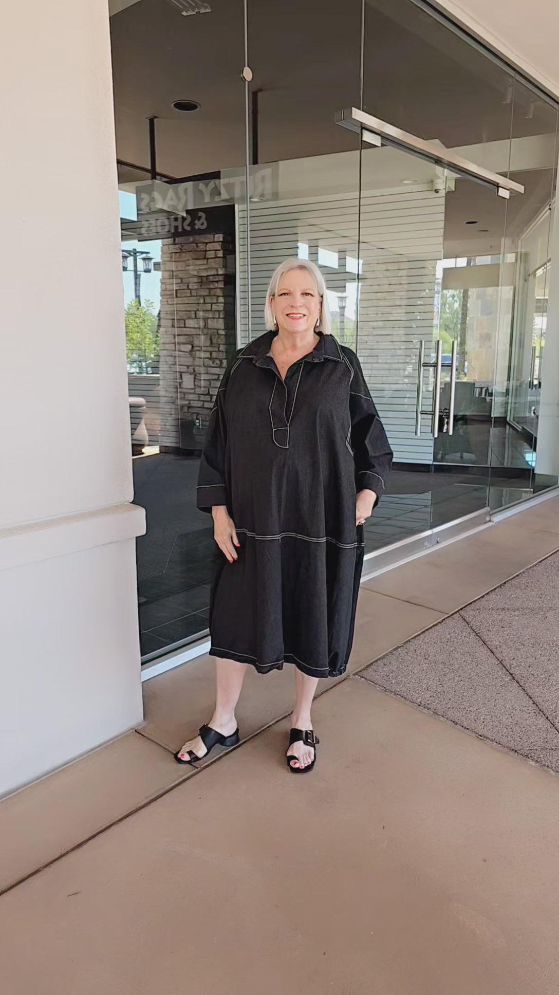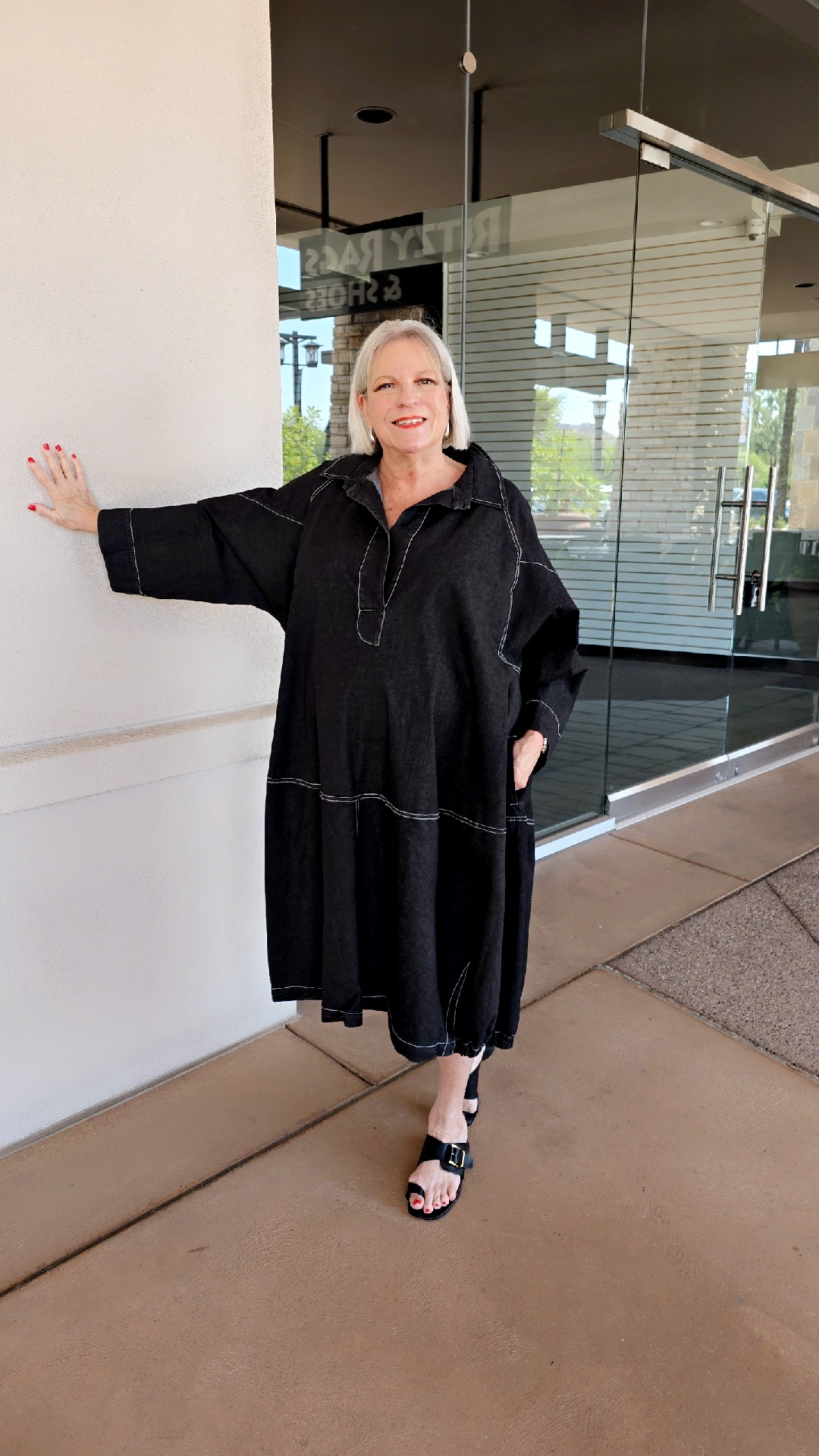 Alembika Black Denim Dress featuring a V-neckline. This pullover design includes three-quarter sleeves, practical side pockets, and a spread collar for a refined look.