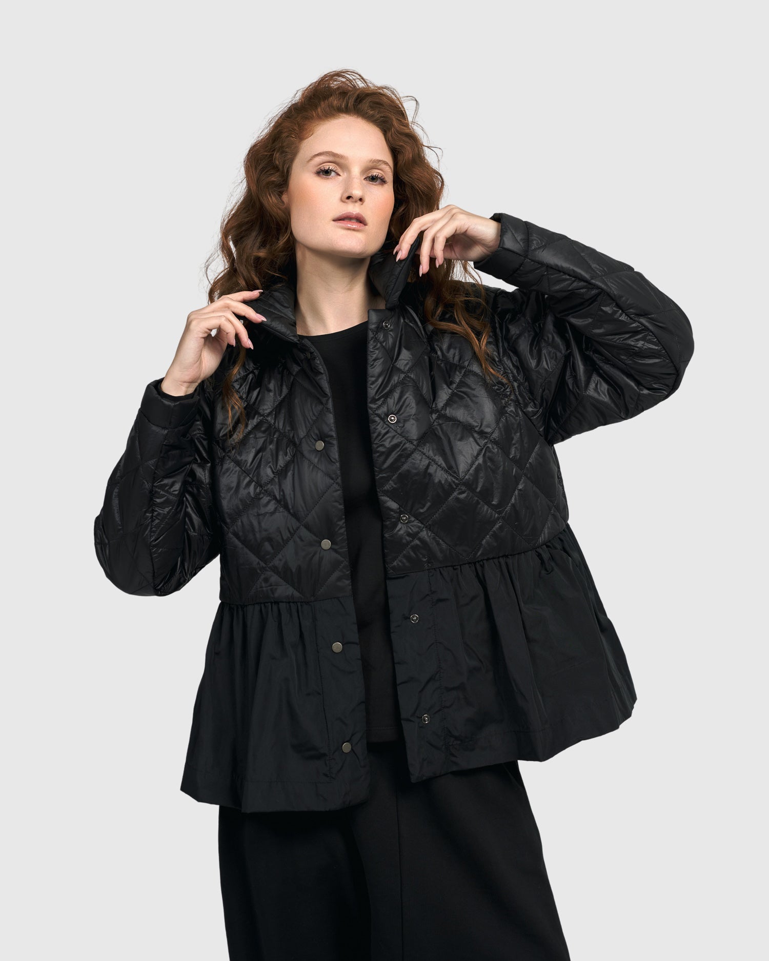 Expertly designed for both style and functionality, the Alembika/Urban Black Quilted Peplum Jacket UJ416B boasts a button front, long sleeves, and a spread collar.
