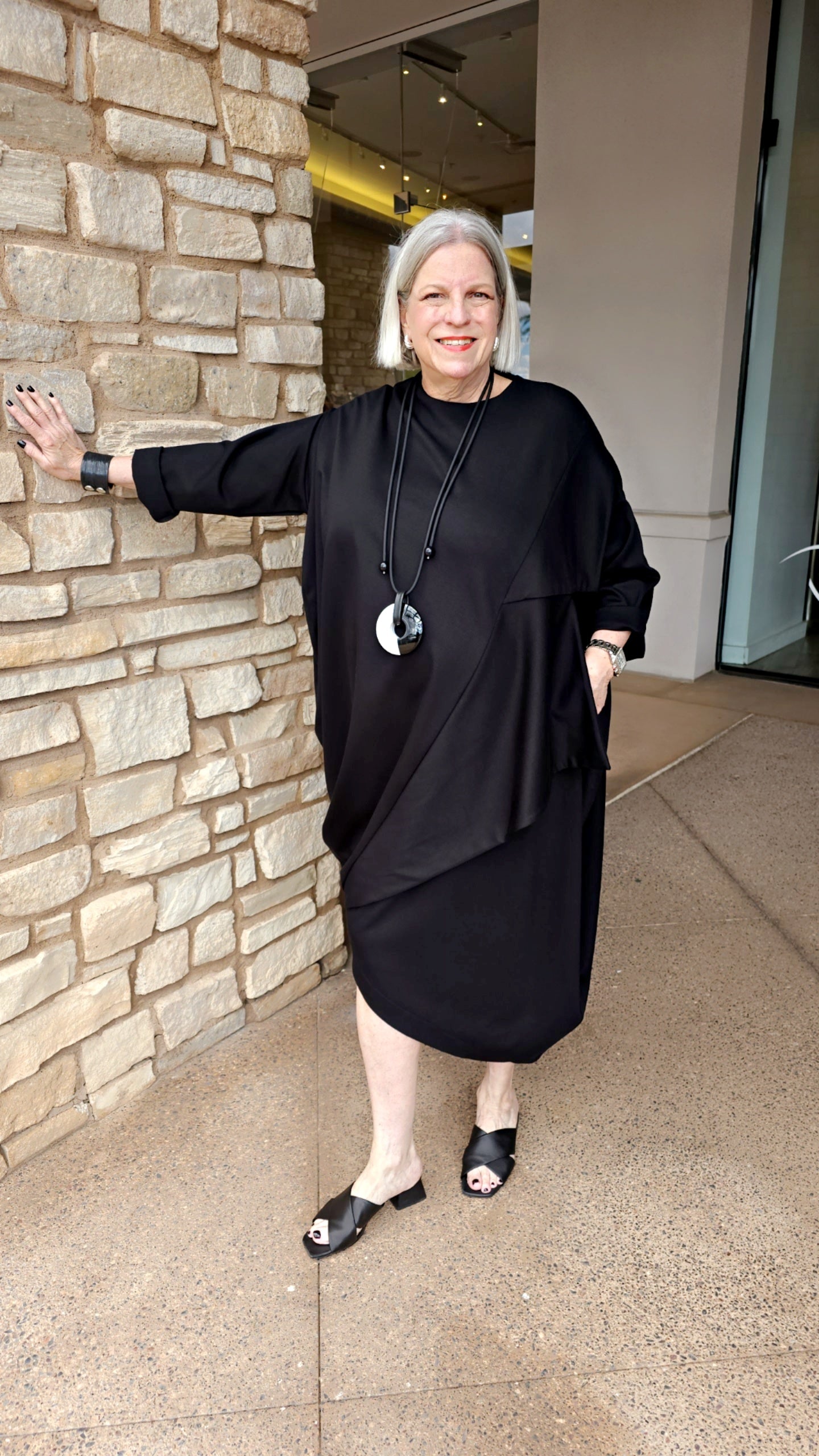 The Alessio Bardelle Black Asymmetrical Long Sleeve Dress features a high round neckline, combining sophistication and comfort.