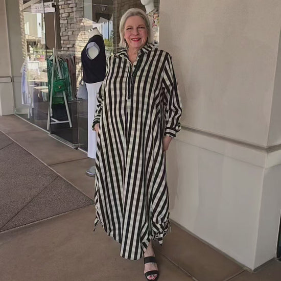 Elevate your everyday style with the Amma Black/Cream Check Tie Dress. This versatile piece features a classic half-button front, long sleeves, and a refined spread collar for a polished look. The decorative ties at the hemline add movement and visual interest. Practical side pockets keep your essentials within reach while maintaining the dress's elegant silhouette. Perfect for transitioning from office to weekend wear.