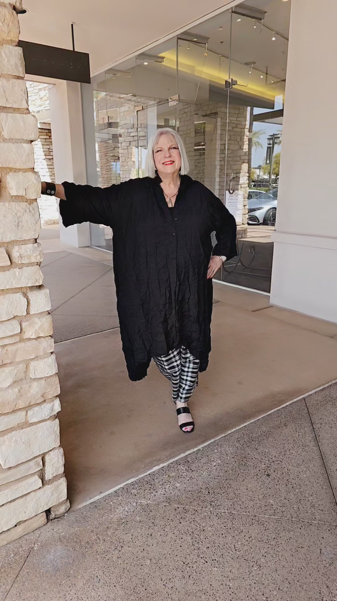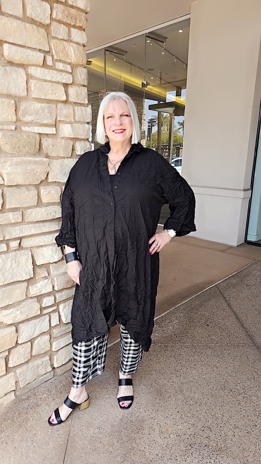 The Baci Black Crinkle Front-Button Back Jacket boasts a sleek 3/4 sleeve design and features a spread collar for added sophistication.