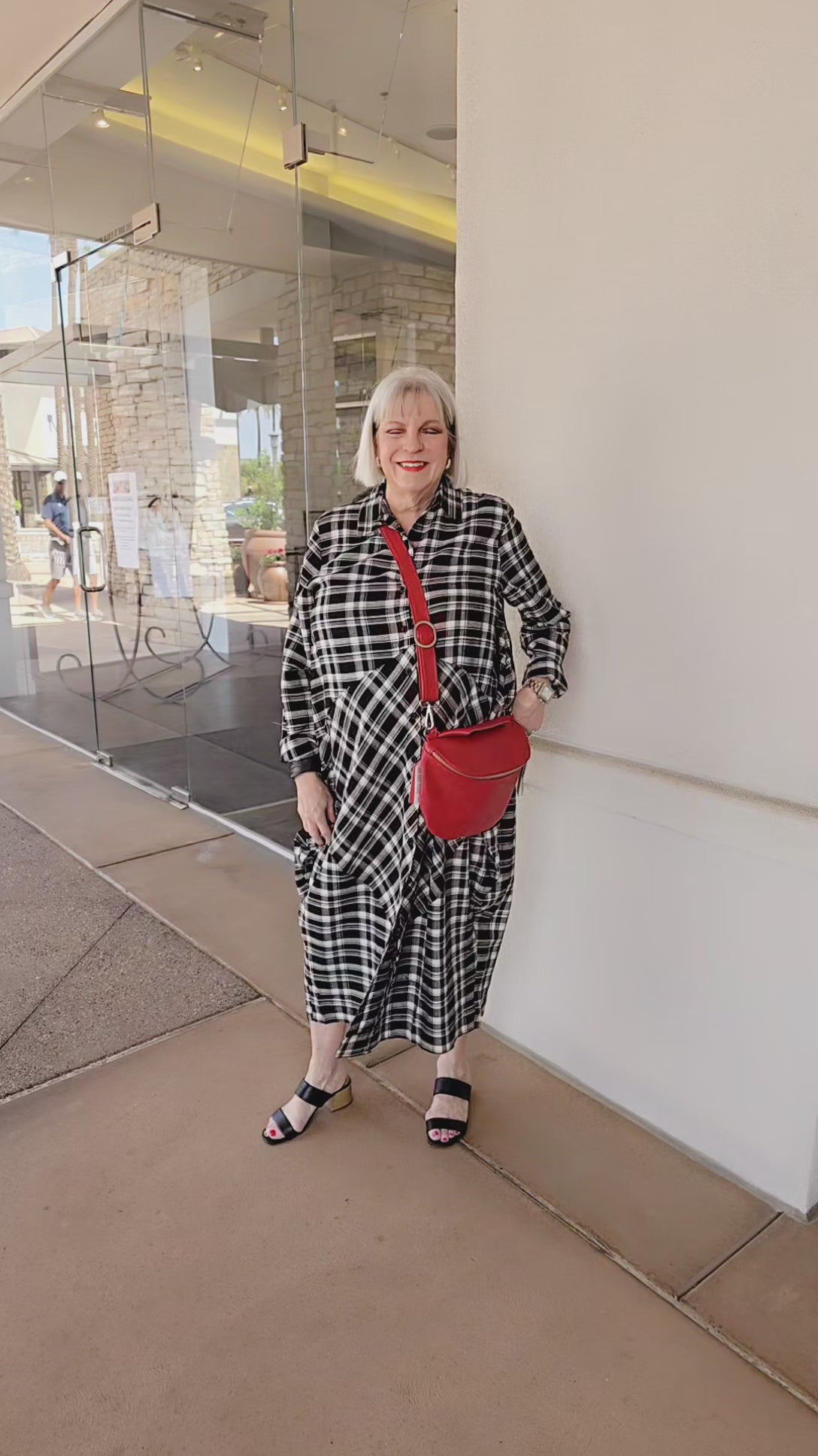 This sophisticated Baci Black/White Plaid Button Front Shirt Dress, featuring a long sleeve design, spread collar, and functional front pockets, offers a timeless and polished aesthetic.