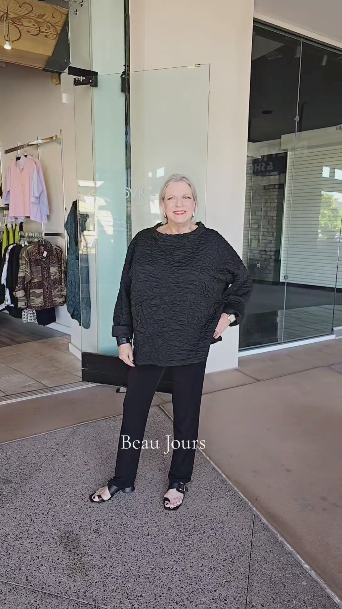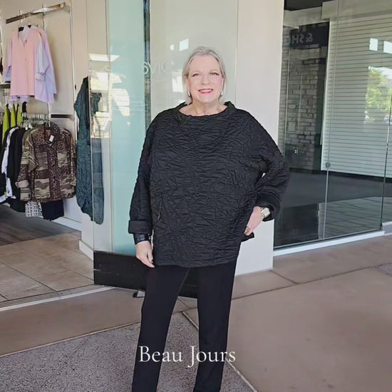 The Beau Jours/Chalet Black Textured Danni Top features a pullover design with a boat neckline, extended drop shoulder sleeves, and a single front pocket for added convenience.