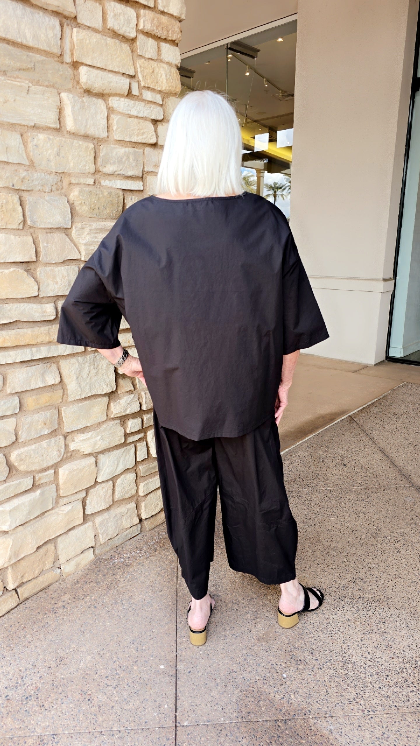 The Chalet/Beau Jours Plus Size Black Sovi Top, features a pullover style, round neckline, short sleeves, and one front pocket, with white embroidered detailing that is fully washable.