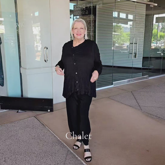 The Chalet Plus Size Linda Top in black features a textured crinkle fabric with a pullover design, side V-neckline, long sleeves, and a single front pocket for added convenience.