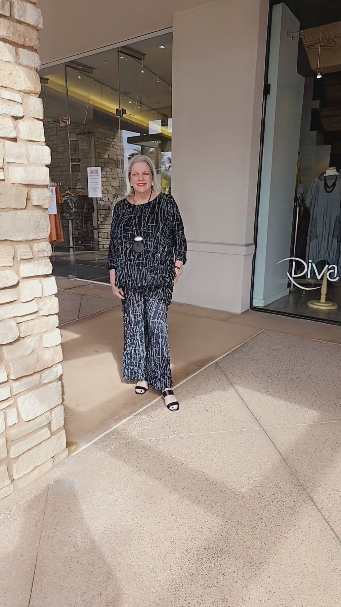 For a sophisticated look, add the Chalet Plus Size Black Print Crinkle Gizel Top to your wardrobe. This pullover style top features 3/4 sleeves, a round neckline, and one front pocket, making it both stylish and functional.