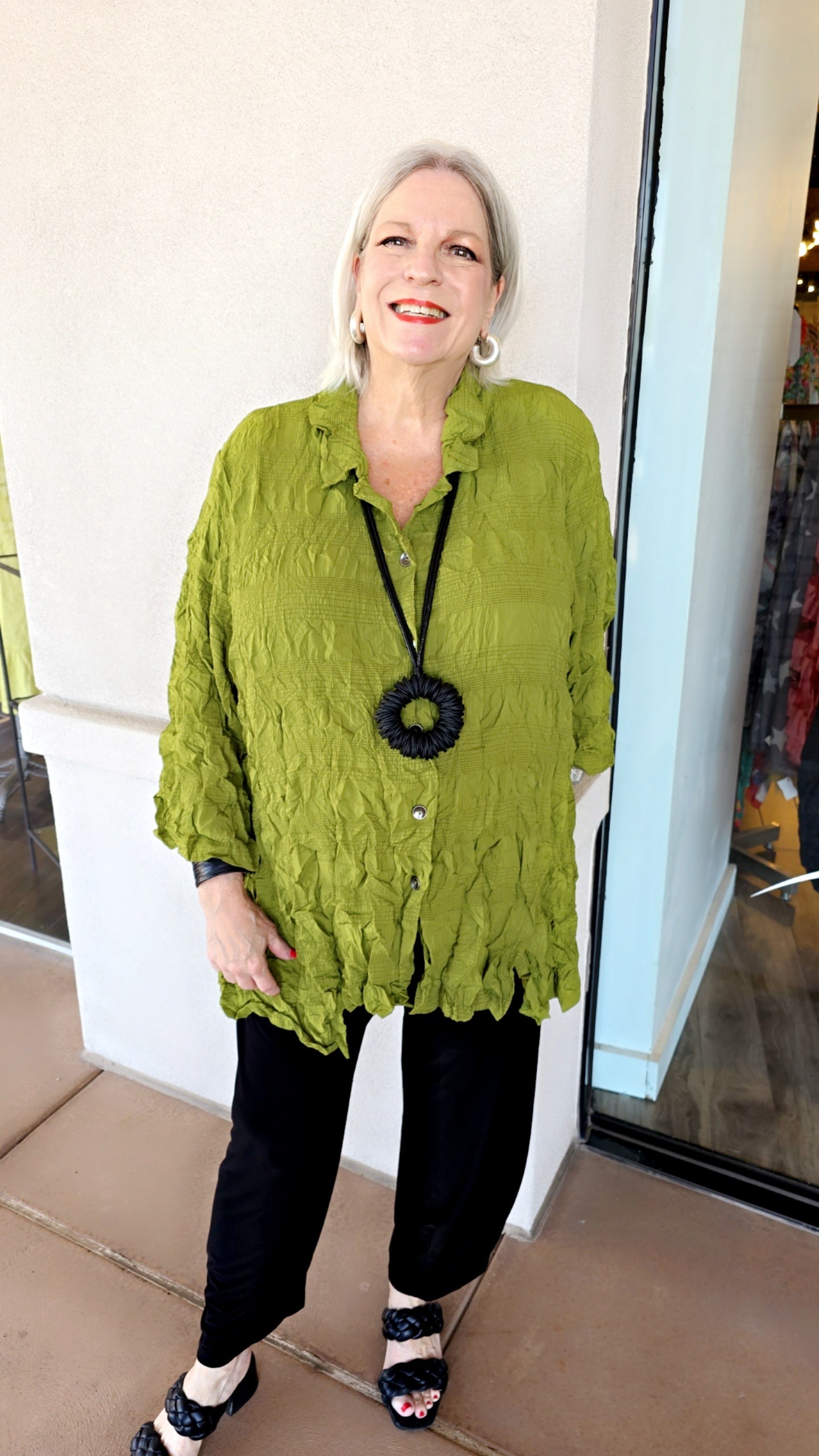 The Chalet Plus Size Crinkle Grass Kehlani Shirt features a spread collar, 3/4 sleeves, and front slits for added style and comfort.