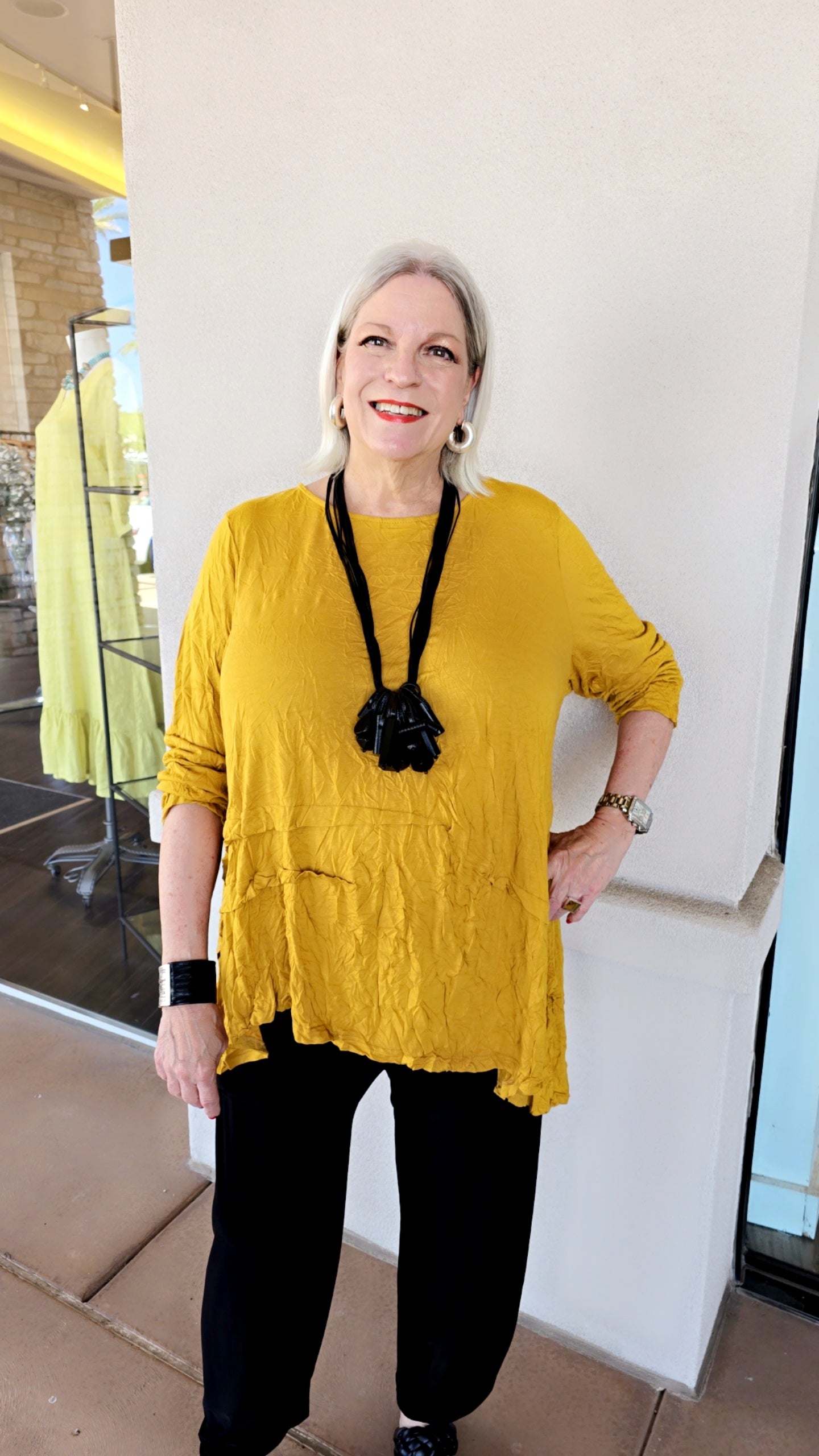 This plus size shirt from Chalet is the perfect addition to your wardrobe. Featuring a stylish crinkle texture, a classic round neckline, and long sleeves, this top is both comfortable and fashionable. The high-low hemline adds a unique touch to the pullover style, making it a versatile and trendy choice.