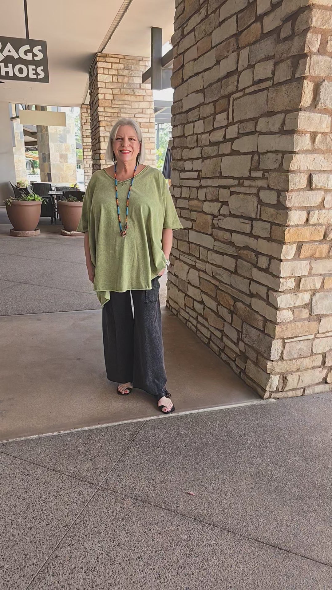 This oversized tunic features a V-neckline and pullover design, crafted from soft Cotton Lani Cilantro fabric in a one-size-fits-all style.