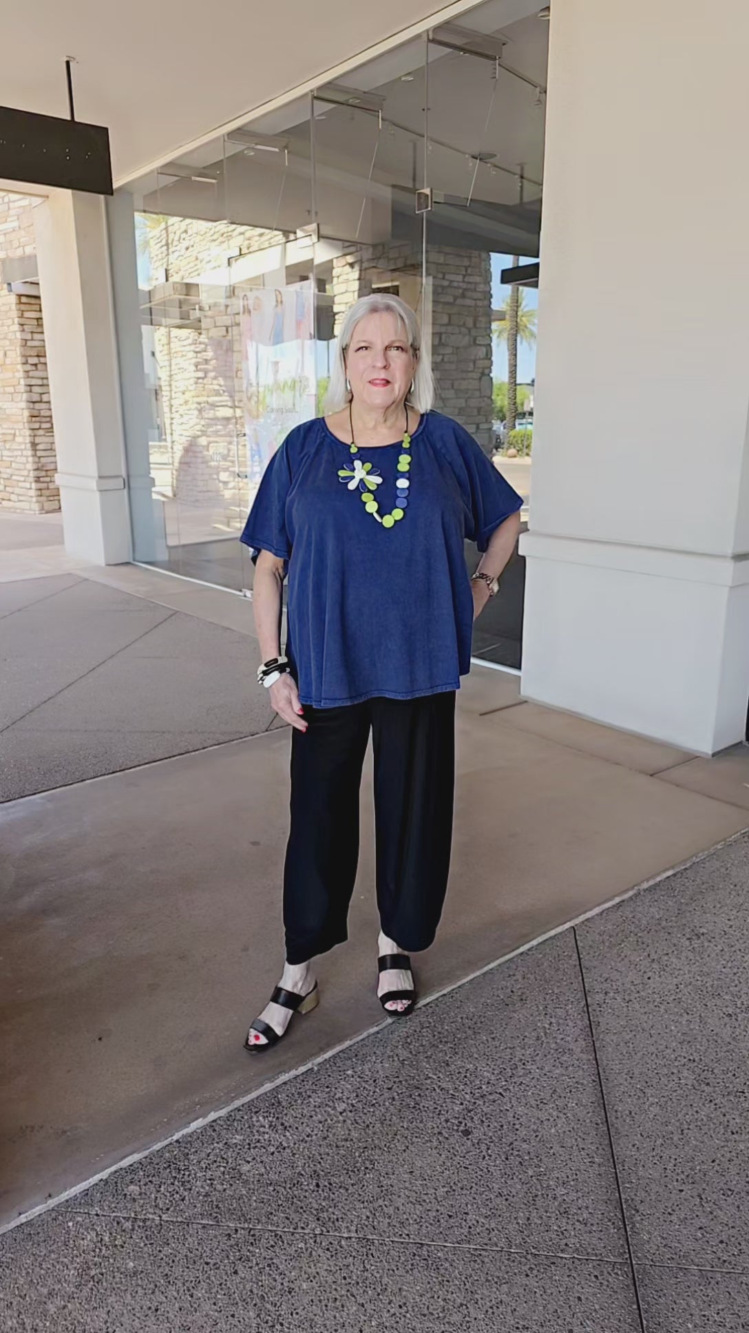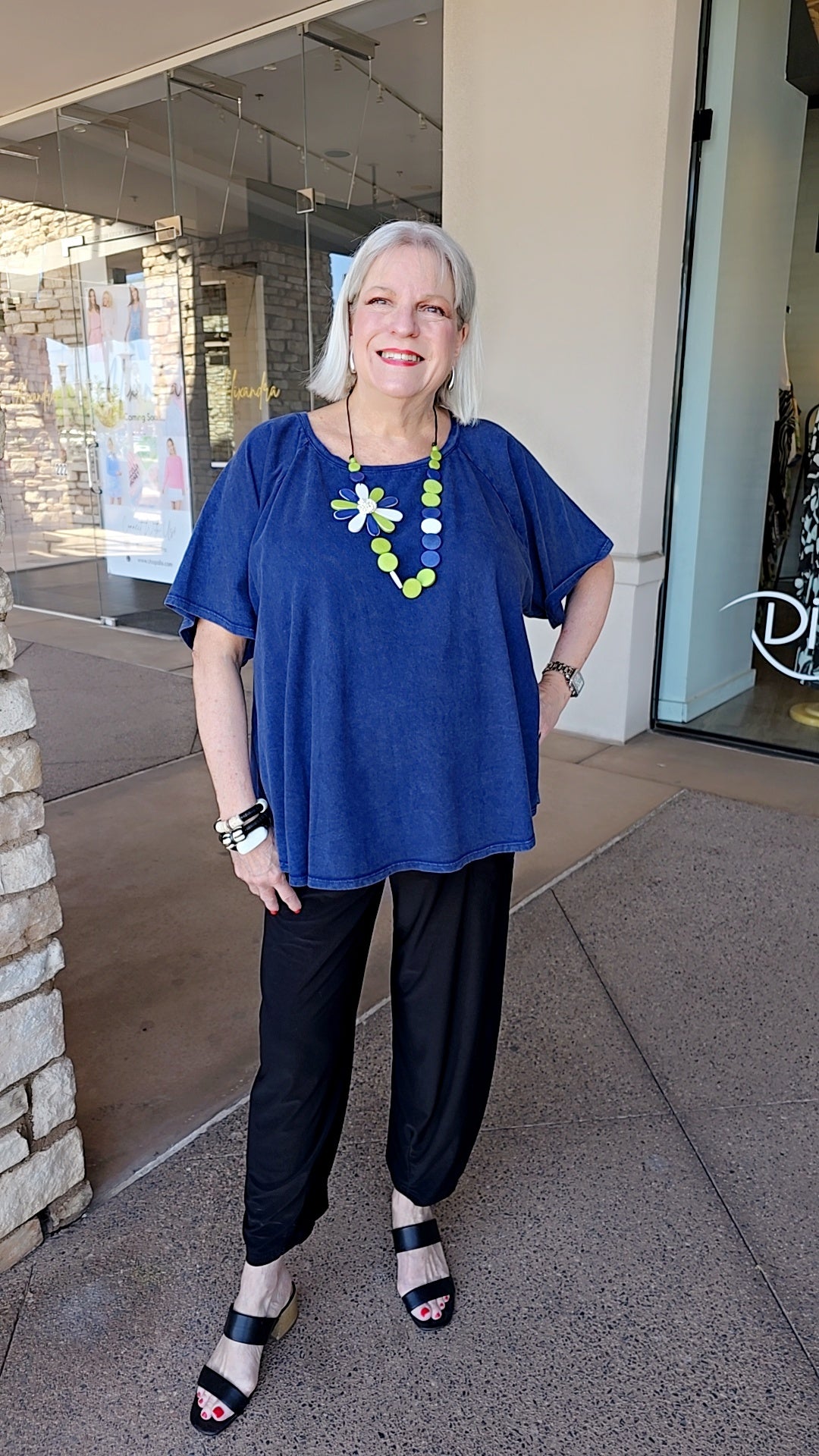 This indigo apple top from Cotton Lani is designed specifically for plus size individuals, with features such as a pullover style, round neckline, short sleeves, and an A-line body frame for ultimate comfort and style.