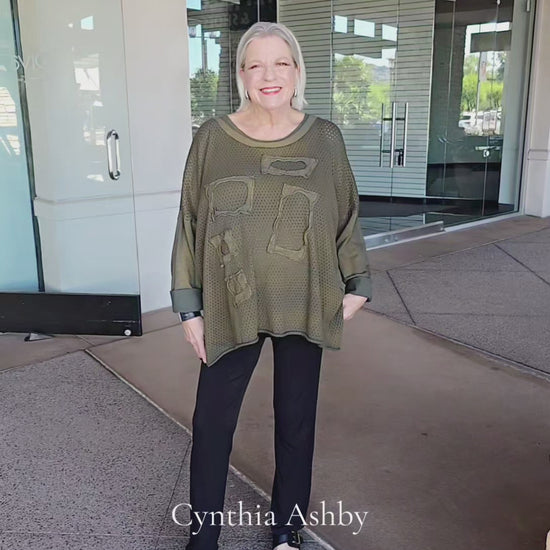 The Cynthia Ashby Polished Green Cheer Sweater features a pullover design with a scoop neckline and long drop shoulder sleeves for a relaxed yet refined fit.