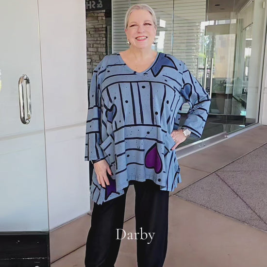 This pullover top combines casual comfort with contemporary flair, featuring a flattering V-neckline and three-quarter sleeves. The uneven hemline adds visual interest while functional front pockets provide everyday practicality. Crafted in durable denim with eye-catching pop art detailing, the Darby offers a versatile piece that transitions effortlessly from weekend wear to casual outings. Designed for plus-size fit with thoughtful construction that celebrates individual style.