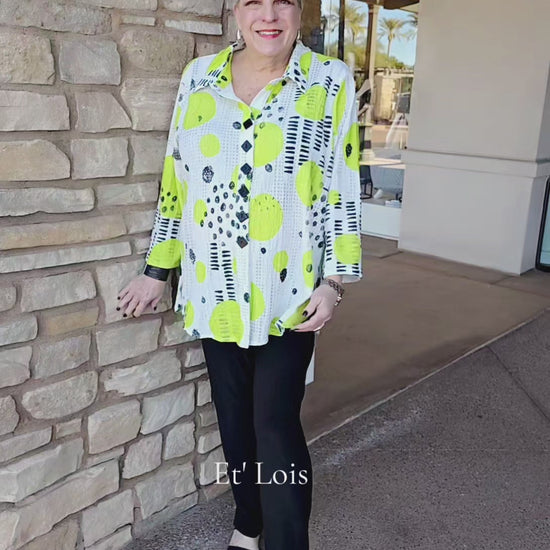 This sophisticated plus-size shirt from Et' Lois features a refined spread collar and convenient button-front closure. The textured dot pattern in crisp white and vibrant lime creates visual interest, while the three-quarter sleeves offer a polished, versatile silhouette perfect for layering or wearing solo. An ideal choice for building a professional wardrobe with contemporary style.