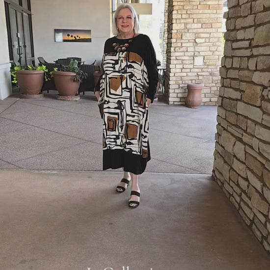 This sophisticated pullover dress from IC Collection features a timeless black and ivory colorway with a relaxed, comfortable fit. The round neckline and long sleeves create an effortlessly elegant silhouette, while the flowing fabric drapes beautifully for all-day wear. Practical side pockets add functionality to this versatile piece, making it perfect for transitional seasons and casual-to-smart occasions.