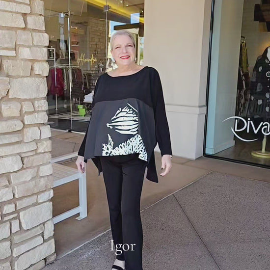 Effortlessly sophisticated, the Igor Black Sola Pullover Top features a gracefully wide neckline and extended drop shoulder sleeves that create an understated, contemporary silhouette. The high-low hemline adds movement and dimension, making this piece a versatile essential for layering or standalone wear.