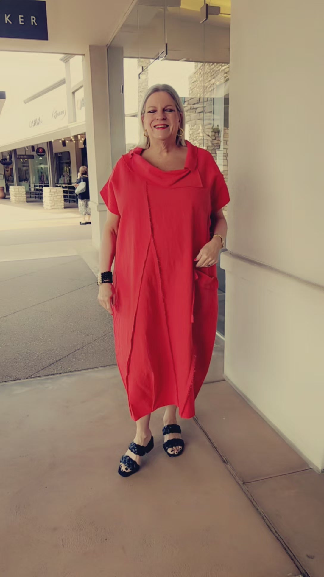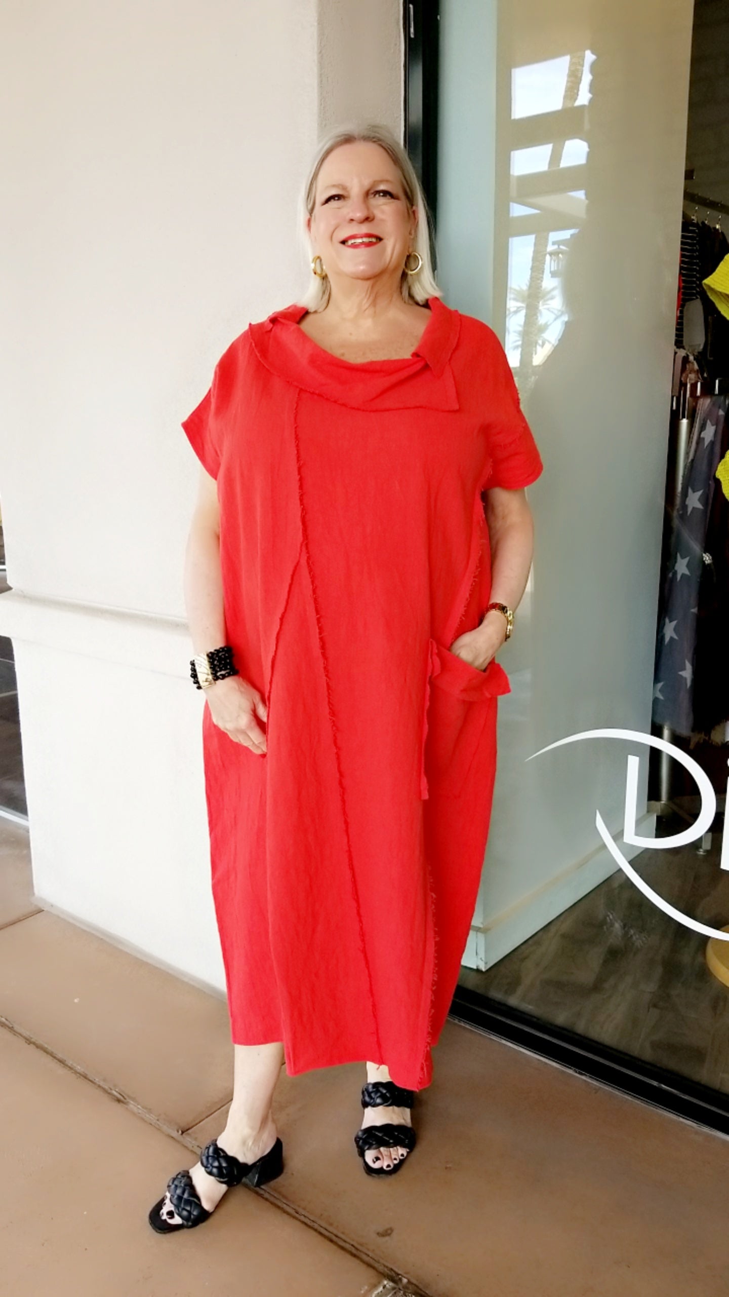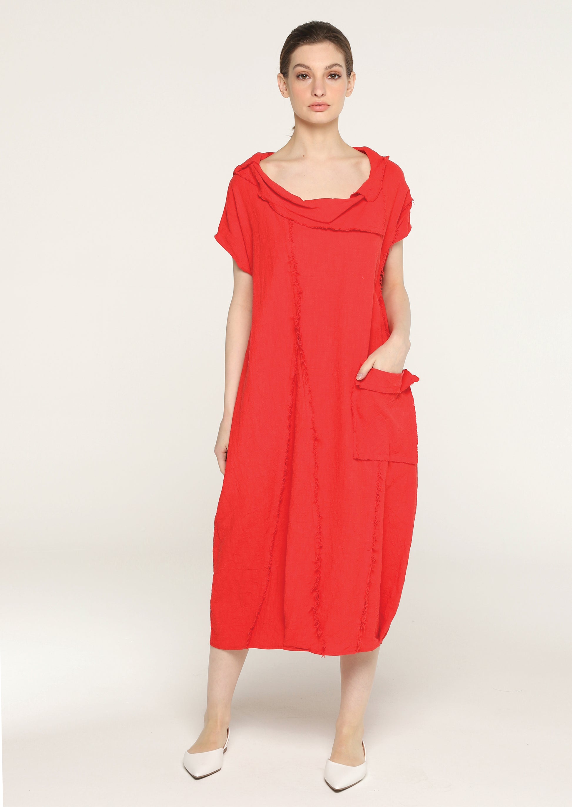 Igor Red Brigitte Dress, Pullover Style, Short Sleeve, One Front Pocket, Cowl Neckline