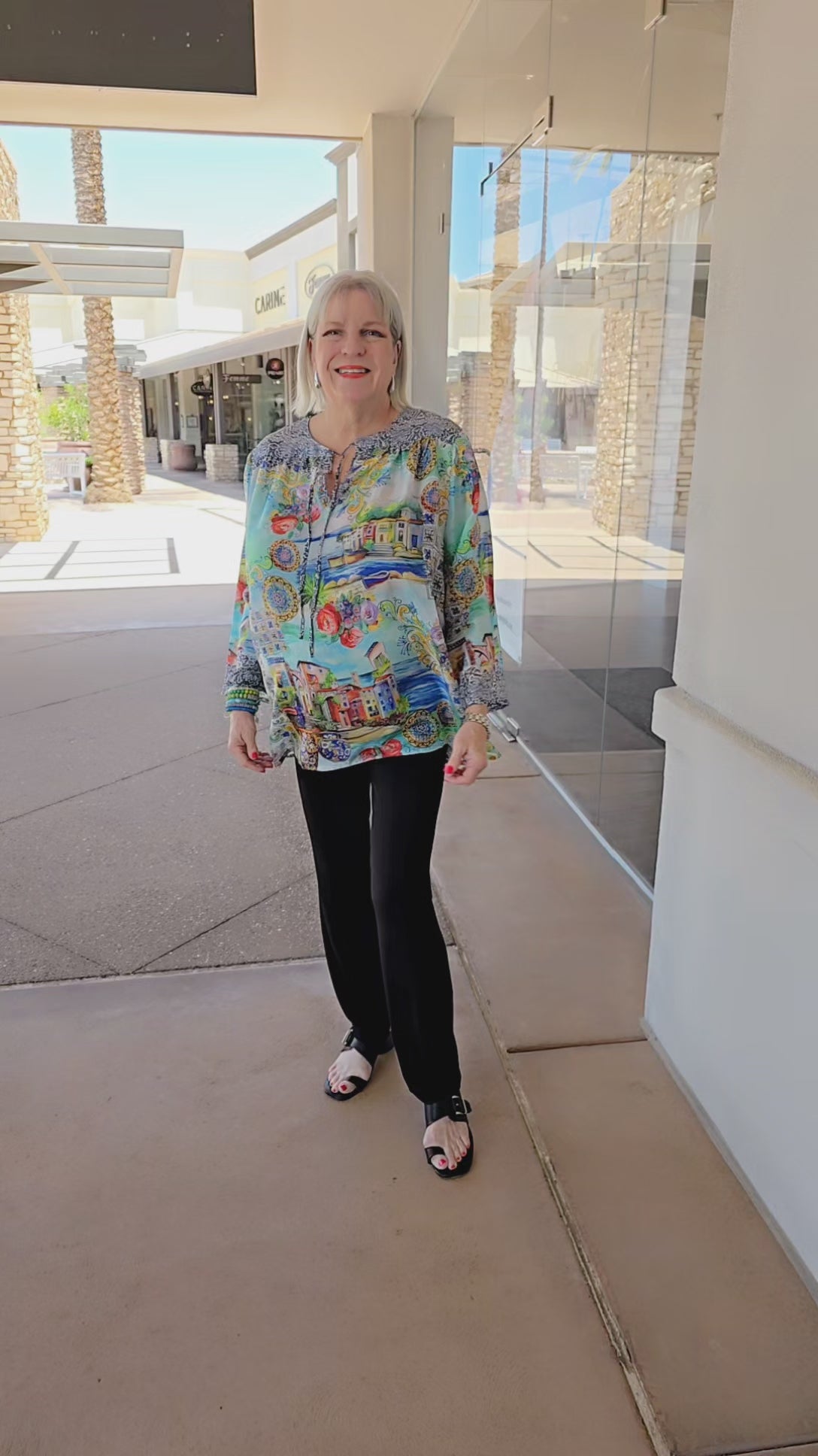 The Johnny Was Christy Lepin blouse features a pullover design with a tie detail at the neckline, elbow-length sleeves, and side vents for added movement and comfort.