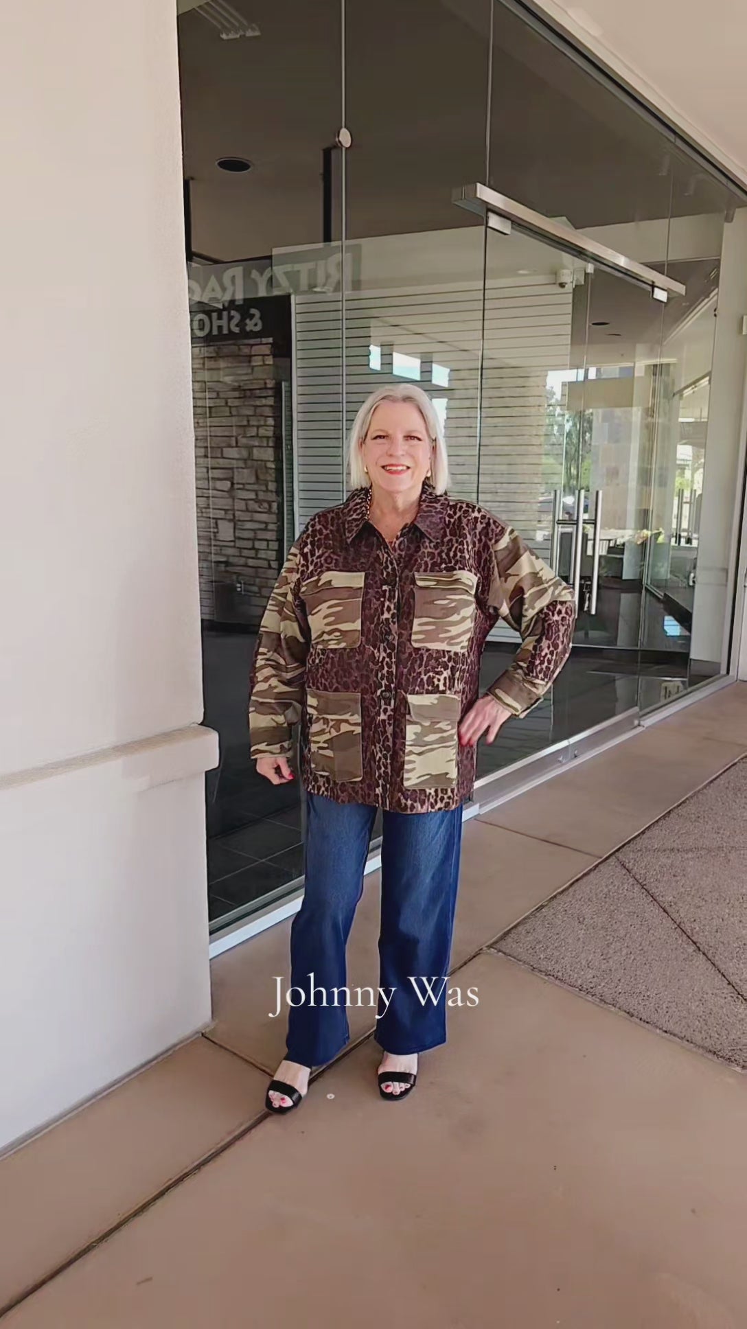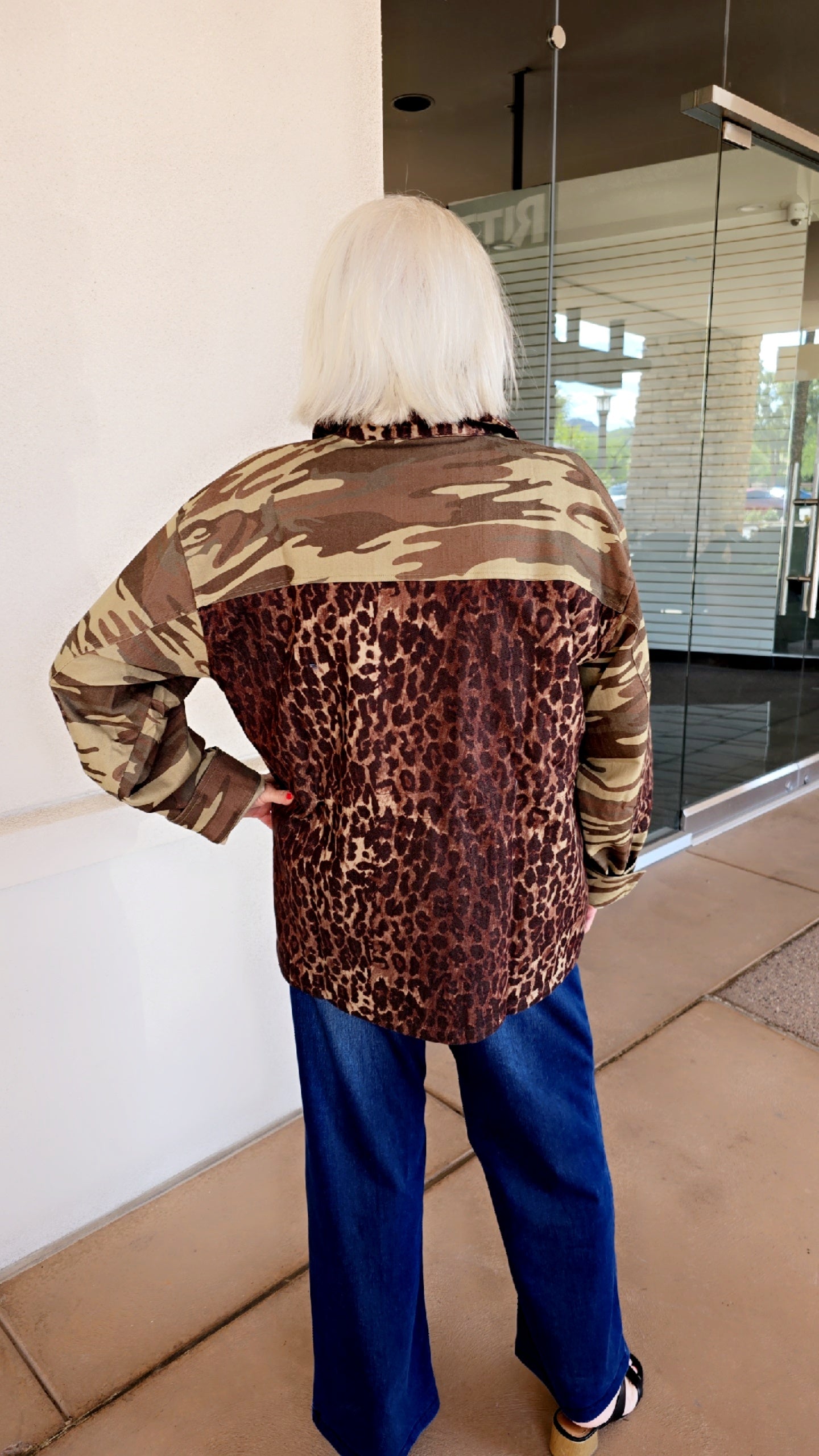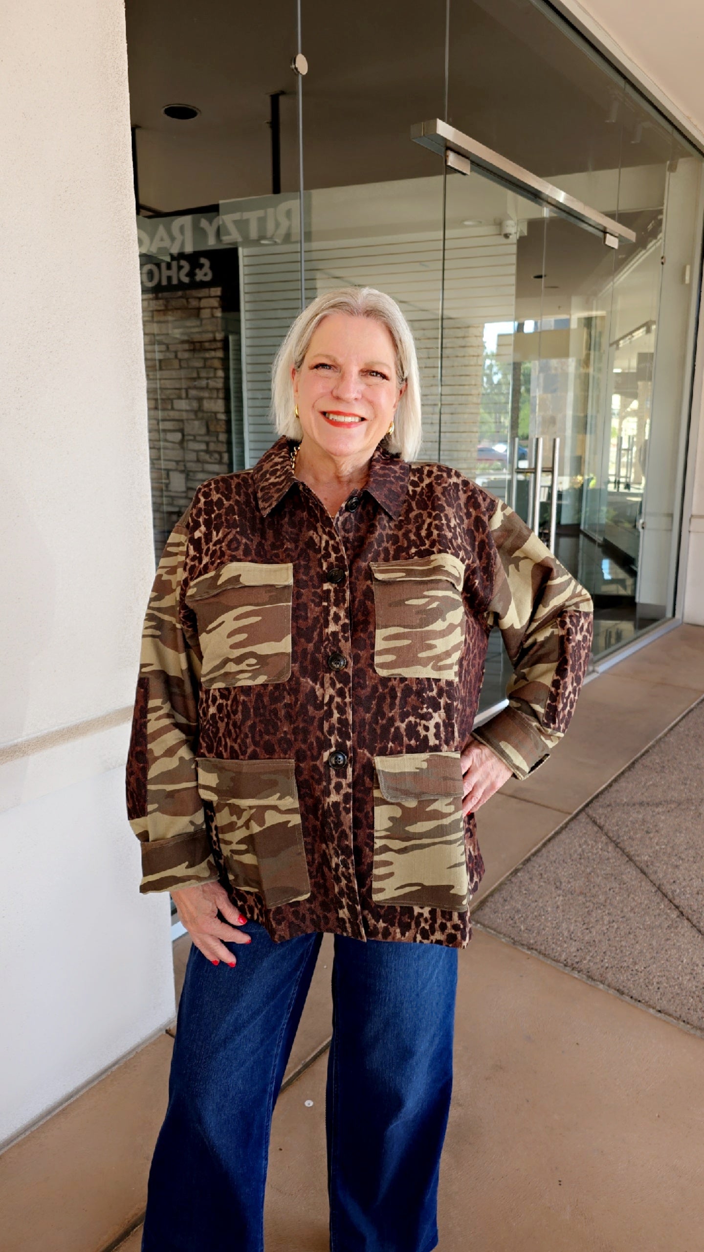 The Johnny Was Leopard Patchwork Jacket features a button-front design with long sleeves, a spread collar, and four front pockets for added functionality.