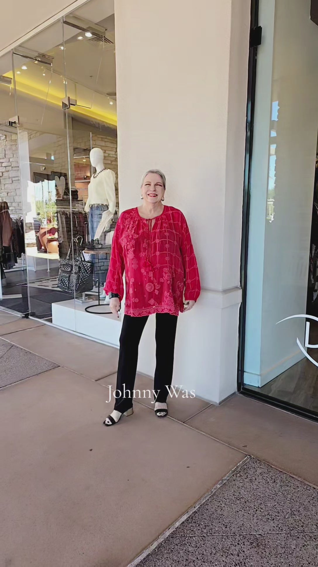 This Johnny Was pullover blouse showcases artisanal patchwork detailing in rich red tones, featuring a relaxed round tie neckline and flowing long sleeves. Subtle side vents provide ease of movement, making it an effortless layering piece that transitions seamlessly from day to evening wear.