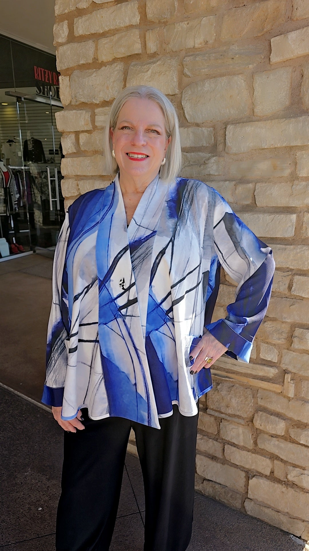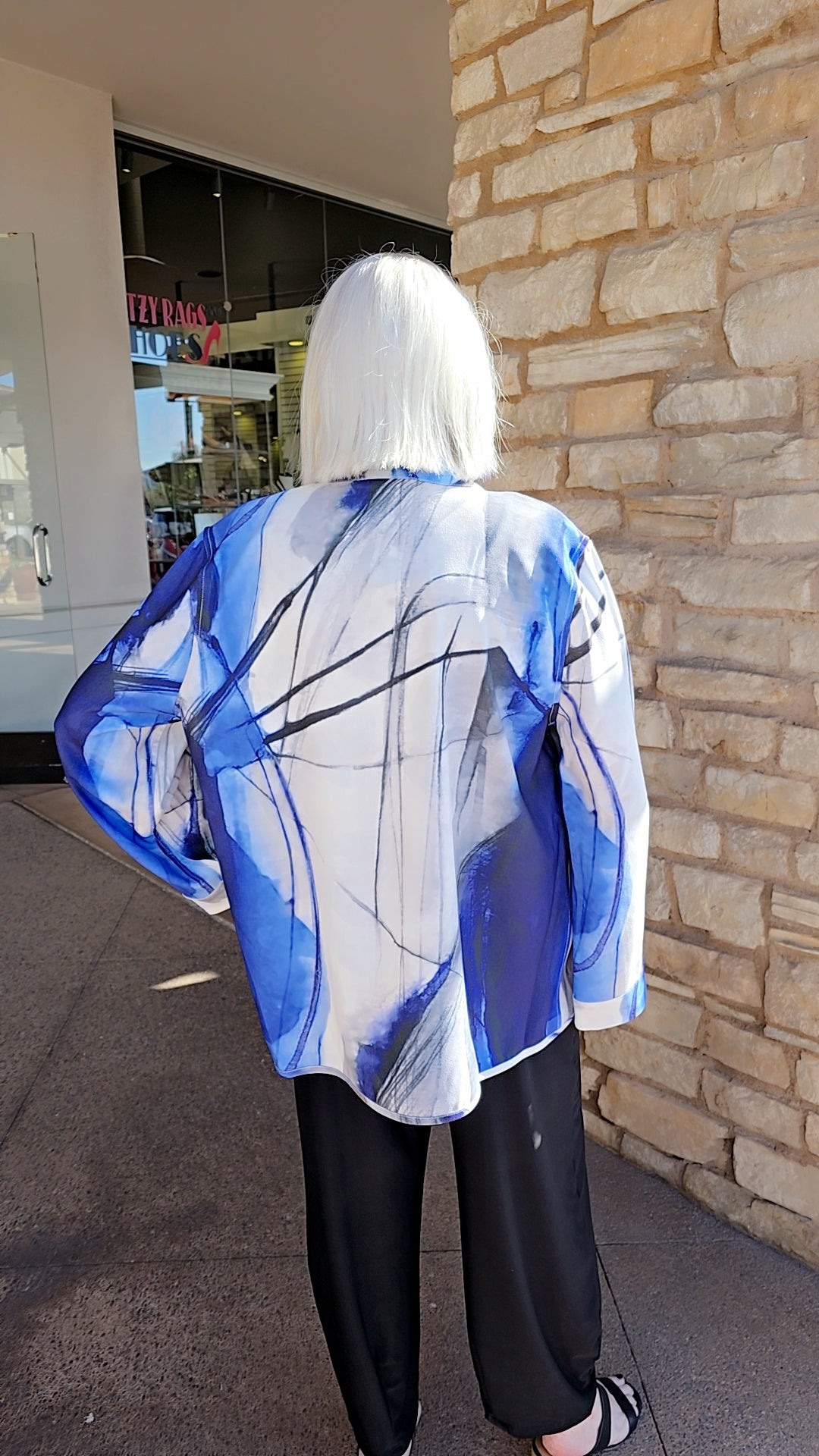 Crafted with lemongrass blue/white fabric, this reversible jacket features a one button closure, long sleeves, and small front pockets, making it a versatile and stylish addition to your wardrobe.