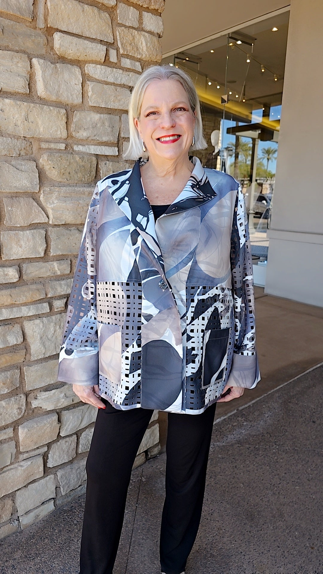 This sophisticated jacket features a refined lemongrass grey tone with distinctive square hole detailing and a streamlined single-button closure. The long sleeves provide elegant coverage, while functional front pockets add practical appeal. A versatile layering piece that transitions seamlessly from professional settings to elevated casual wear.