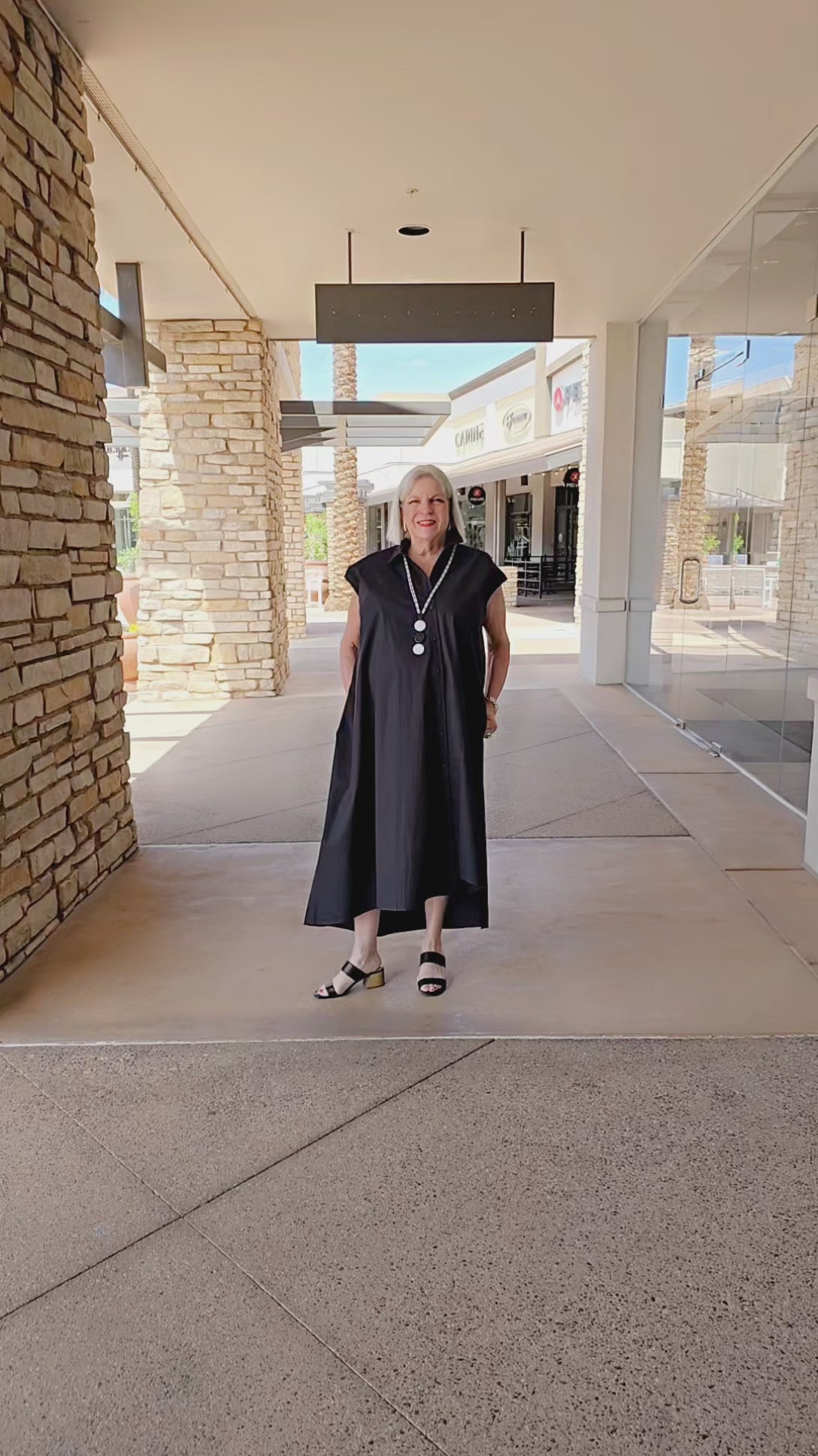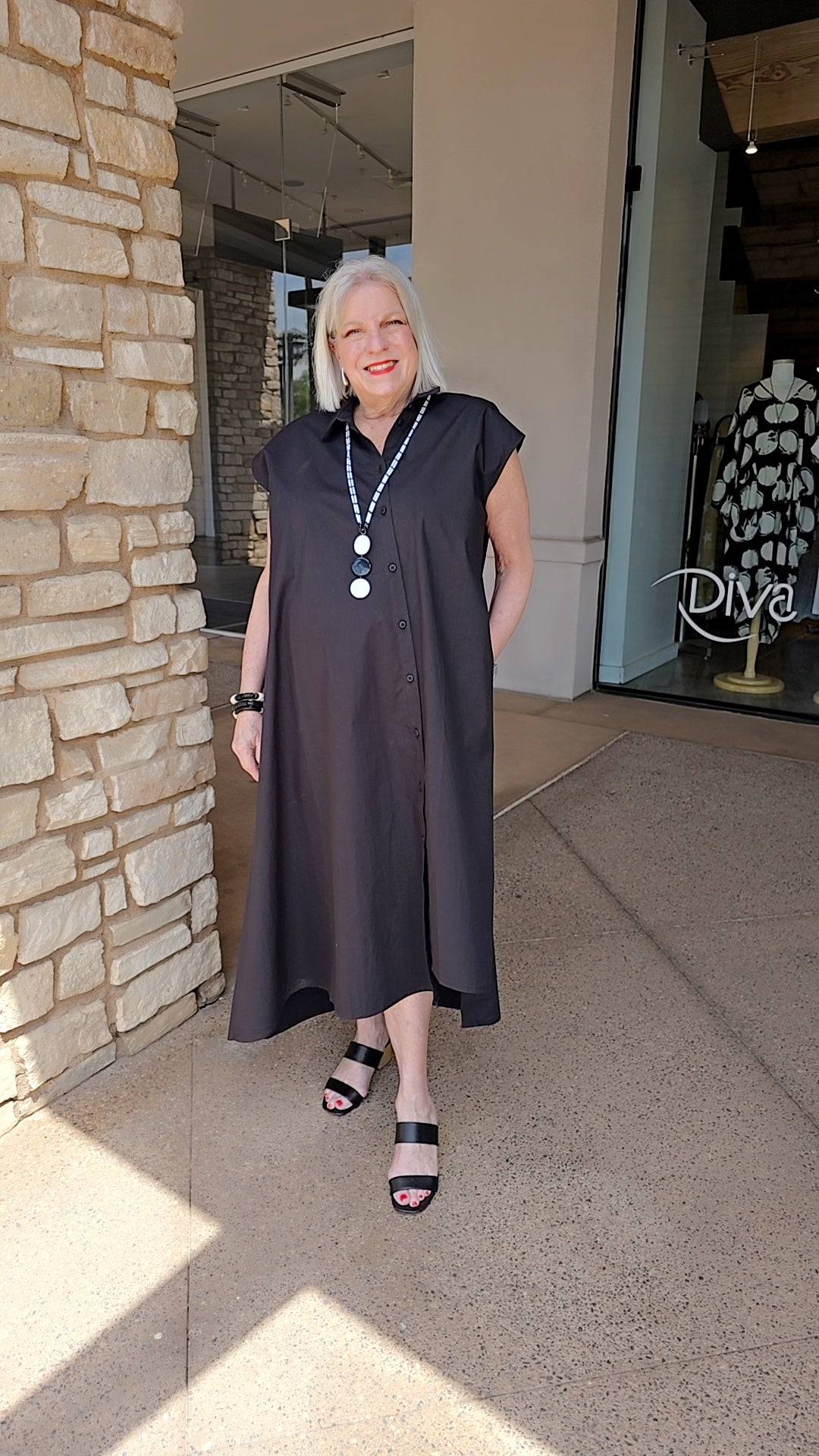 The Lotus Eaters Black Angled Button Front Sleeveless Dress, featuring a Spread Collar and Side Pockets, is a versatile and practical addition to any wardrobe.