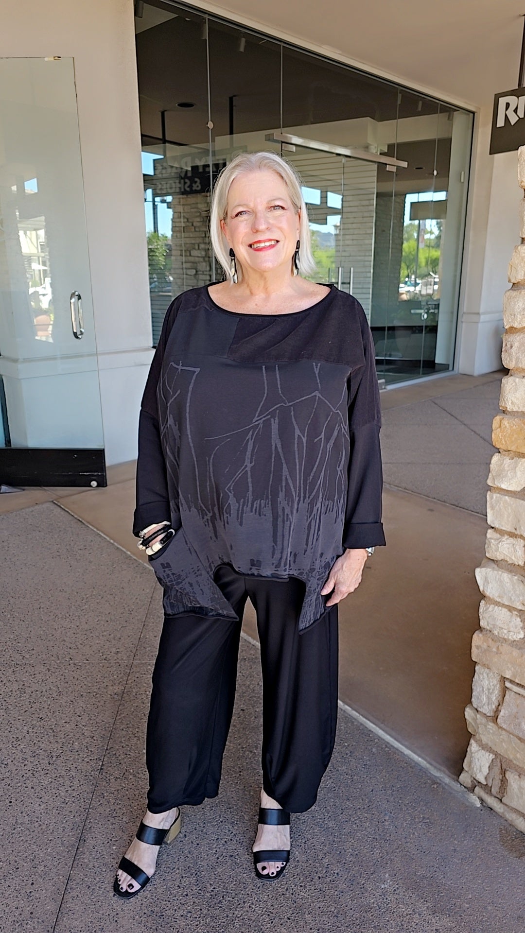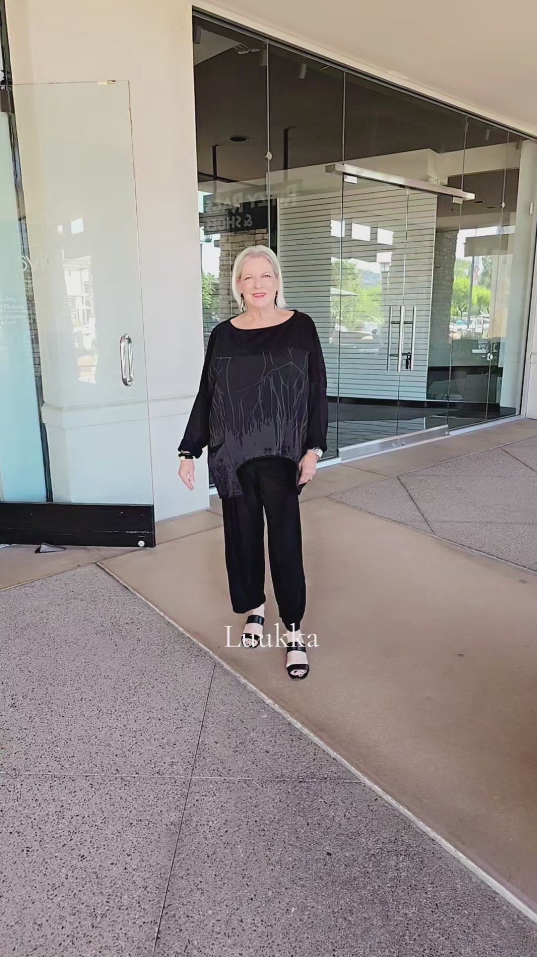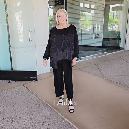 The Luukka Black Pullover Sweatshirt features long dolman sleeves, an asymmetrical hemline, and a single front pocket for added functionality.