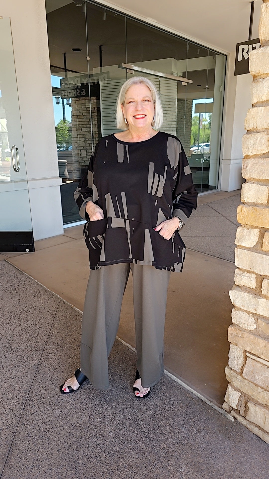 This Luukka plus size top features a pullover design with a round neckline and long drop shoulder sleeves. Crafted in a khaki and black two-tone knit, it includes convenient front pockets for added functionality.