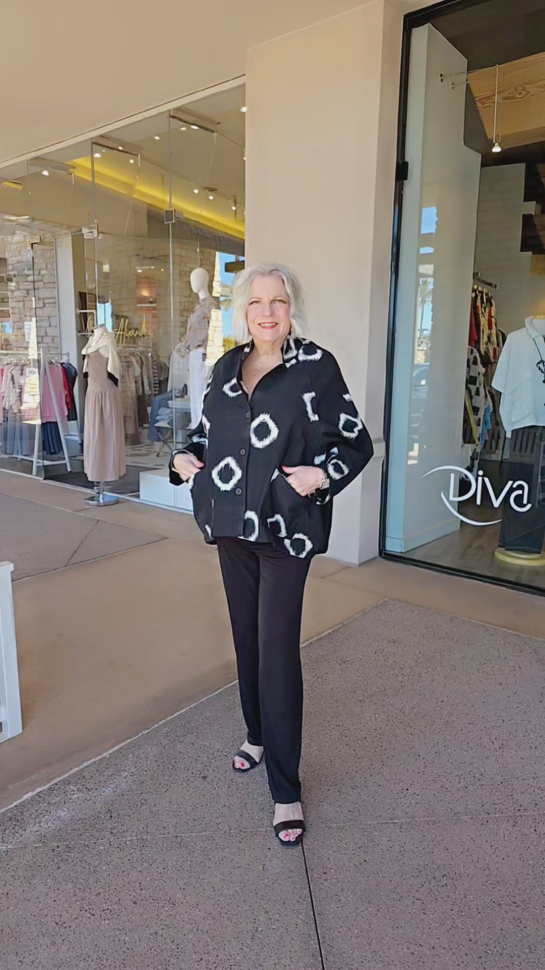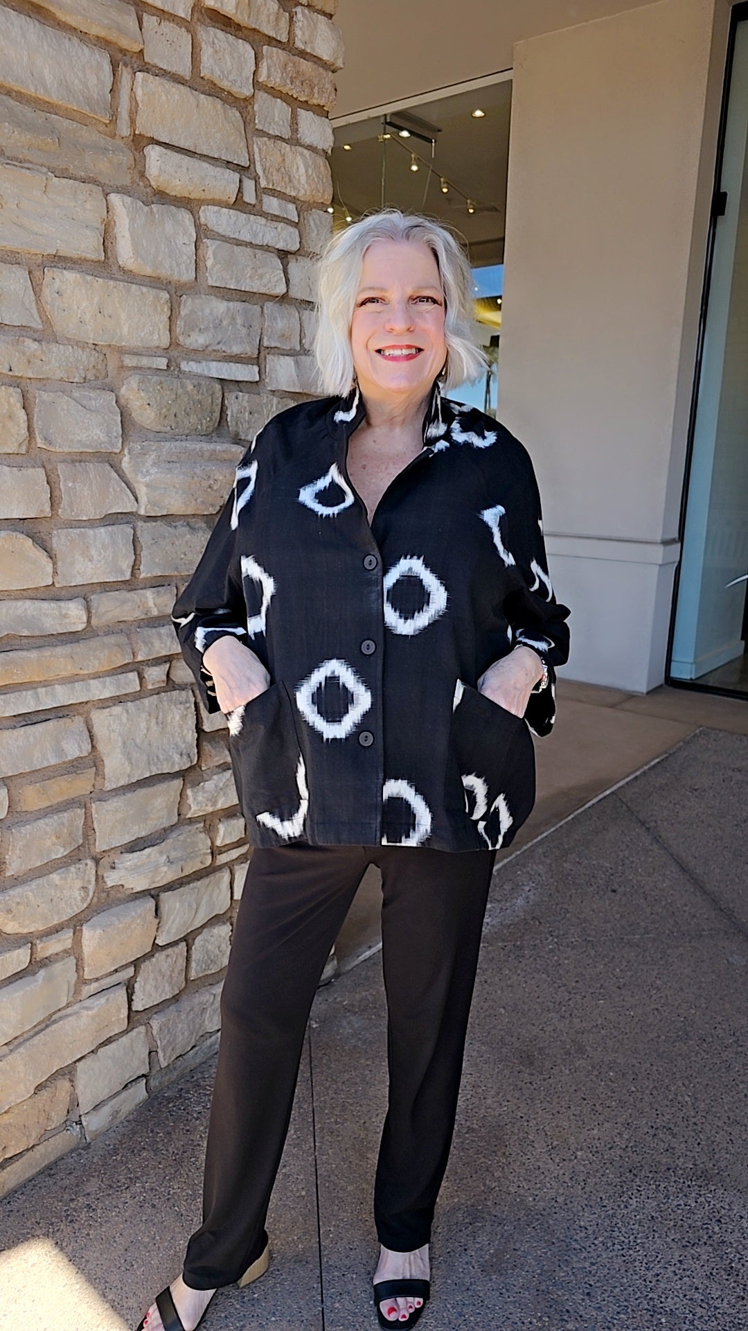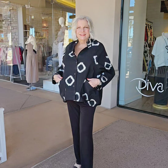 This sophisticated button-front shirt combines timeless black and white tones with a striking ruby accent pocket. Designed with a flattering V-neckline and voluminous balloon silhouette, it features long sleeves and an elegant high-low hemline that adds movement and dimension. Perfect for layering or wearing solo, this versatile piece elevates any wardrobe with its refined construction and modern styling details.