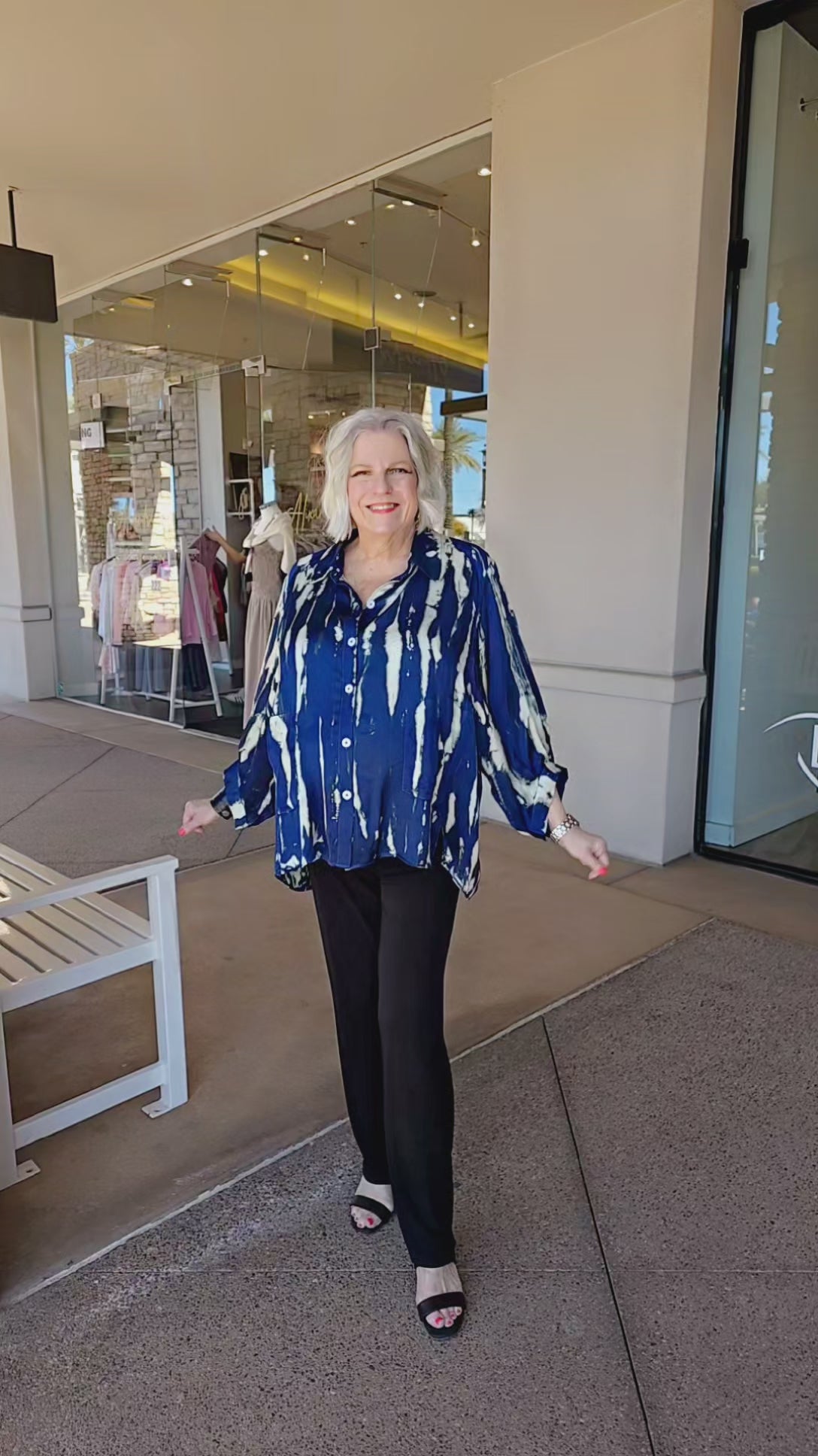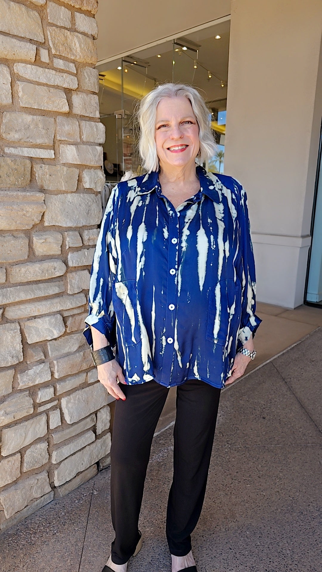 Elevate your wardrobe with this sophisticated button-front top, featuring a refined spread collar and graceful 3/4 balloon sleeves that balance structure with movement. Practical front pockets add everyday functionality, while the subtle high-low hemline creates visual interest and modern appeal. The diffuse blue hue offers versatile styling options for both professional and casual settings.