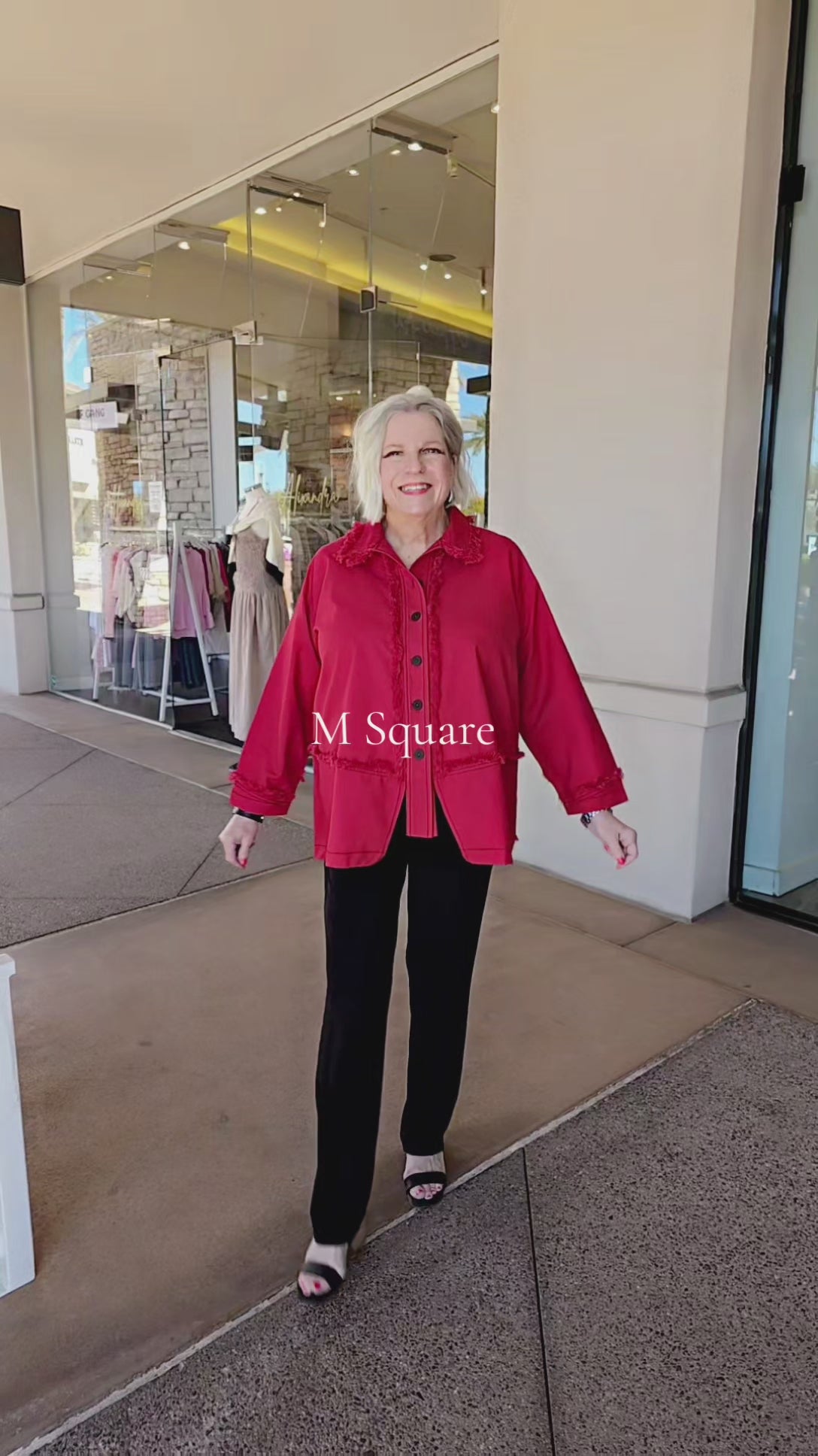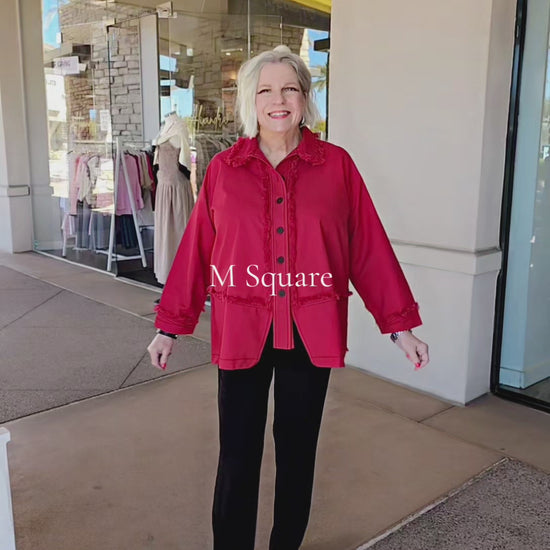 Elevate your wardrobe with this sophisticated long-sleeve top, featuring a classic spread collar and convenient button-front closure. The striking red hue is complemented by bold contrast fringe detailing that adds movement and visual interest to every wear. A versatile piece that transitions seamlessly from casual to polished occasions.