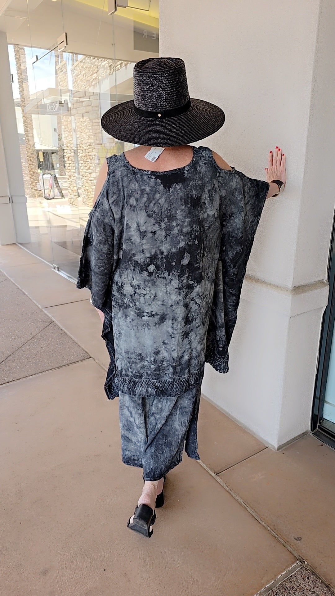 The Manta Del Lago Plus Size Washed Black Cold Shoulder Top boasts a pullover style, round neckline, and 3/4 sleeve. The detailed hemline adds a touch of sophistication and elegance to this top.