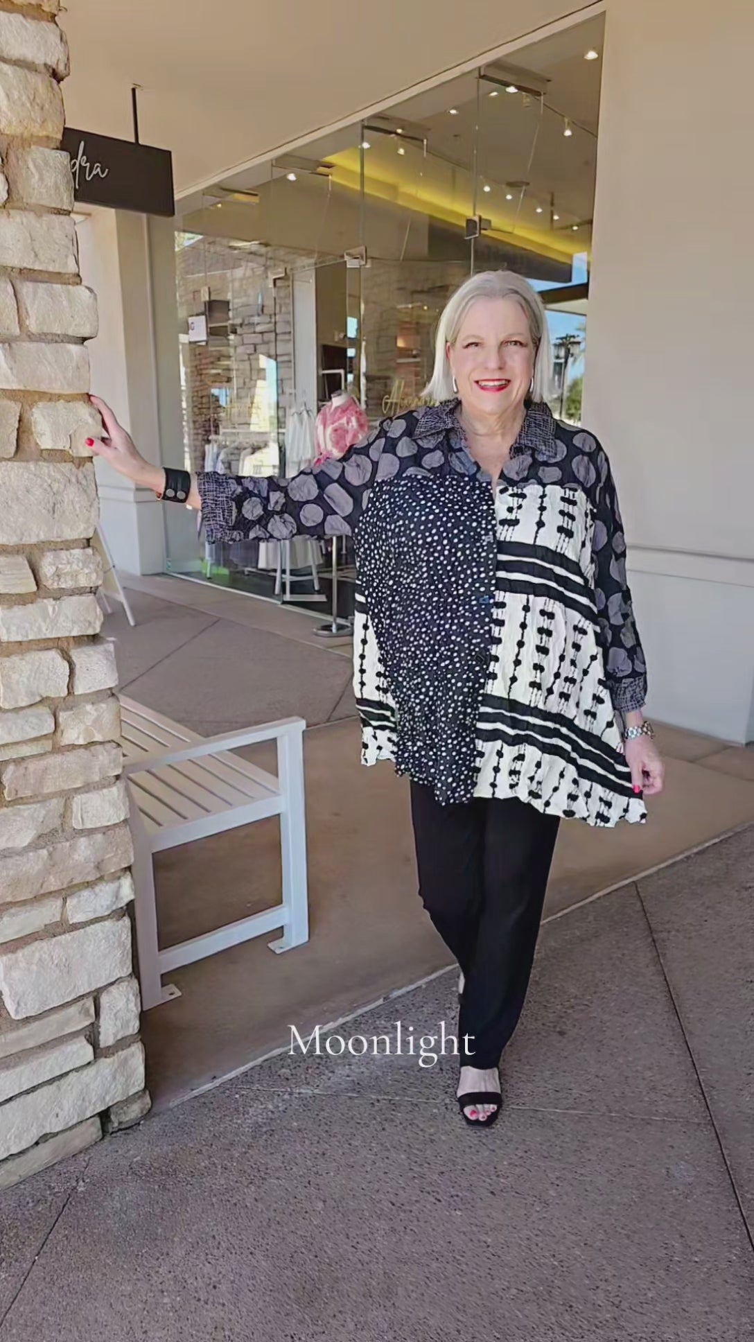 Crafted with a refined crinkle texture, this button-front top features a classic spread collar and three-quarter sleeves for effortless sophistication. The Moonlight Patch design delivers understated elegance, making it a versatile essential for any wardrobe. Perfect for layering or wearing solo, this piece transitions seamlessly from day to evening.
