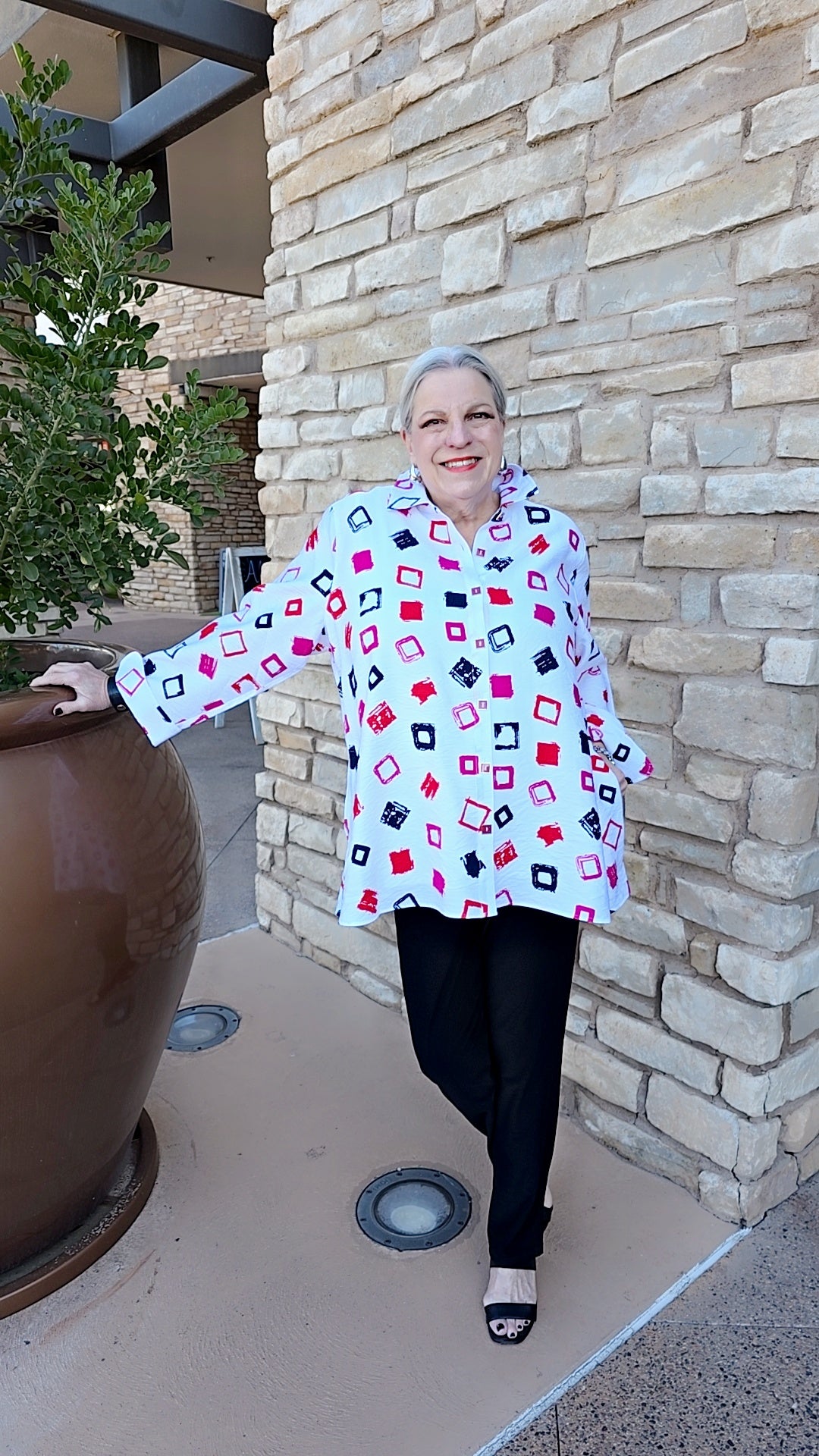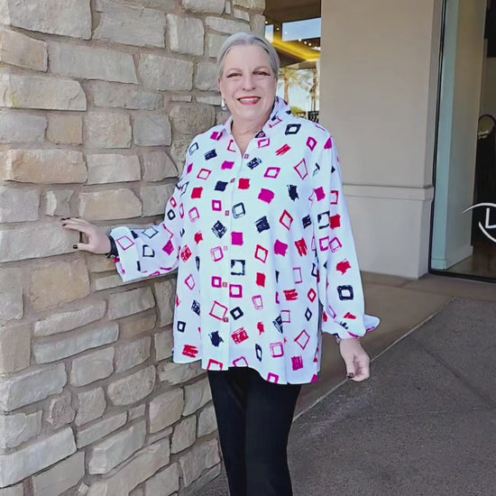 This versatile button-front shirt features a sophisticated multi-square print design paired with practical 3/4 sleeves and rolled cuffs for an effortless, polished look. The spread collar adds structure while hidden side pockets provide functional convenience. An essential layering piece that transitions seamlessly from casual to professional settings.