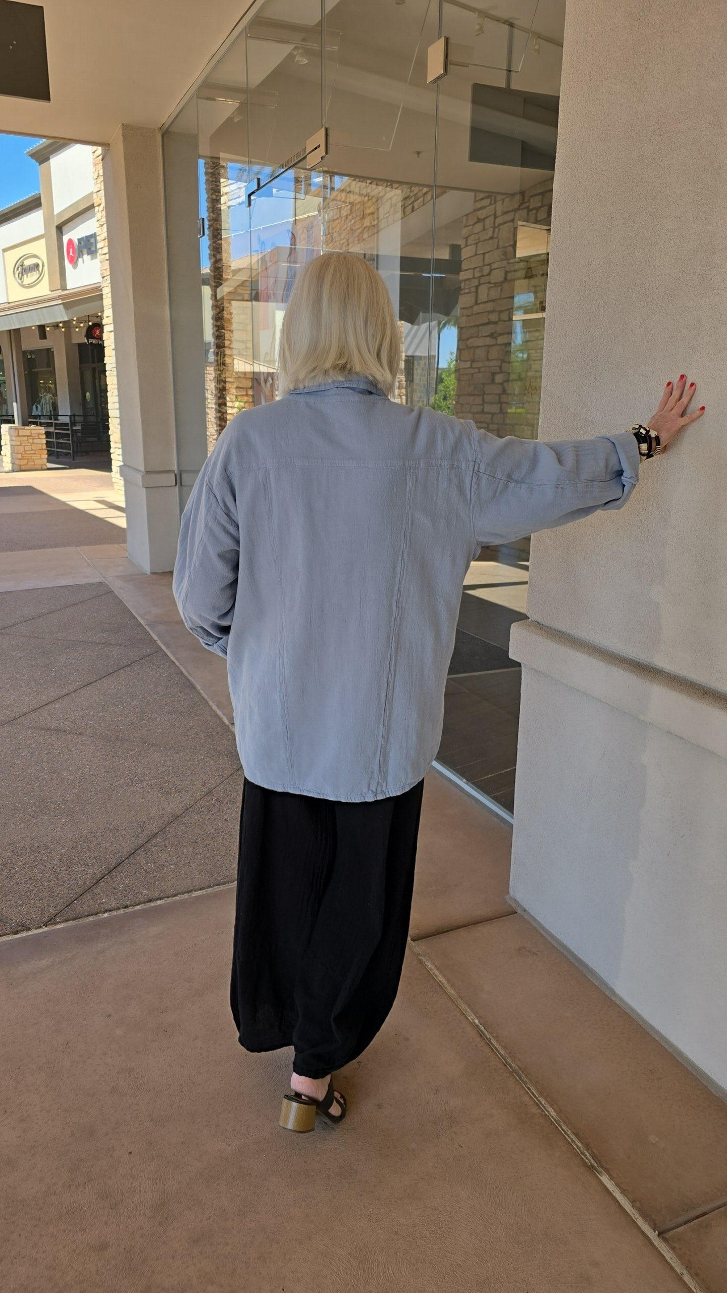 Expertly crafted Oh My Gauze Blue Dusty Button Jacket featuring functional design elements including four convenient front pockets, a sophisticated spread collar, and full-length sleeves. This versatile outerwear piece combines practicality with refined style.