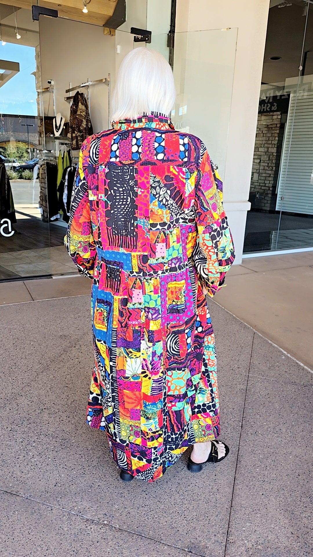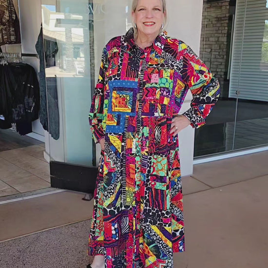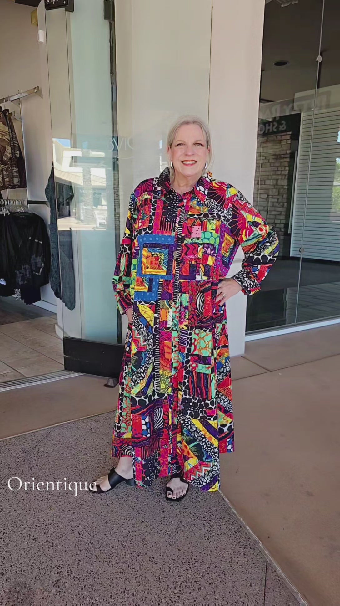 The Orientique Plus Size Multi Print Dress features a button-front design, long sleeves, side pockets, and a gathered hemline, combining style with practical details.