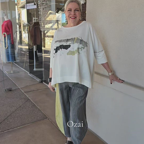This refined pullover combines contemporary design with practical styling. The three-quarter sleeves offer versatile layering options, while strategically placed side vents provide ease of movement and a flattering silhouette. A classic round neckline completes the look with timeless appeal. The barcode graphic adds an edgy, modern touch that elevates everyday wear into statement-worthy fashion.