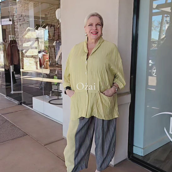 This expertly crafted button-front shirt features a flattering V-neckline and relaxed 3/4 drop shoulder sleeves that create an effortlessly polished silhouette. The textured crinkle fabric in a vibrant yellow hue adds visual interest and dimension to your wardrobe. Practical front pockets provide functional style, making this versatile piece perfect for layering or wearing solo. An ideal choice for those seeking quality construction with contemporary design details.