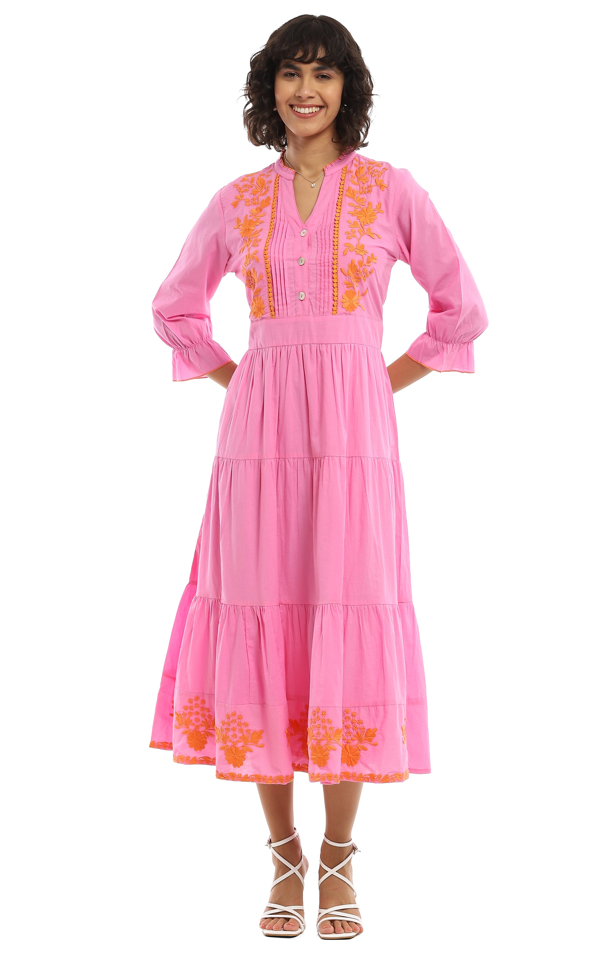 Presenting the Parsley & Sage Pink Ina Tier Dress - a pullover style with 3/4 sleeves, a V-neckline, and a half button front for a stylish and comfortable look.