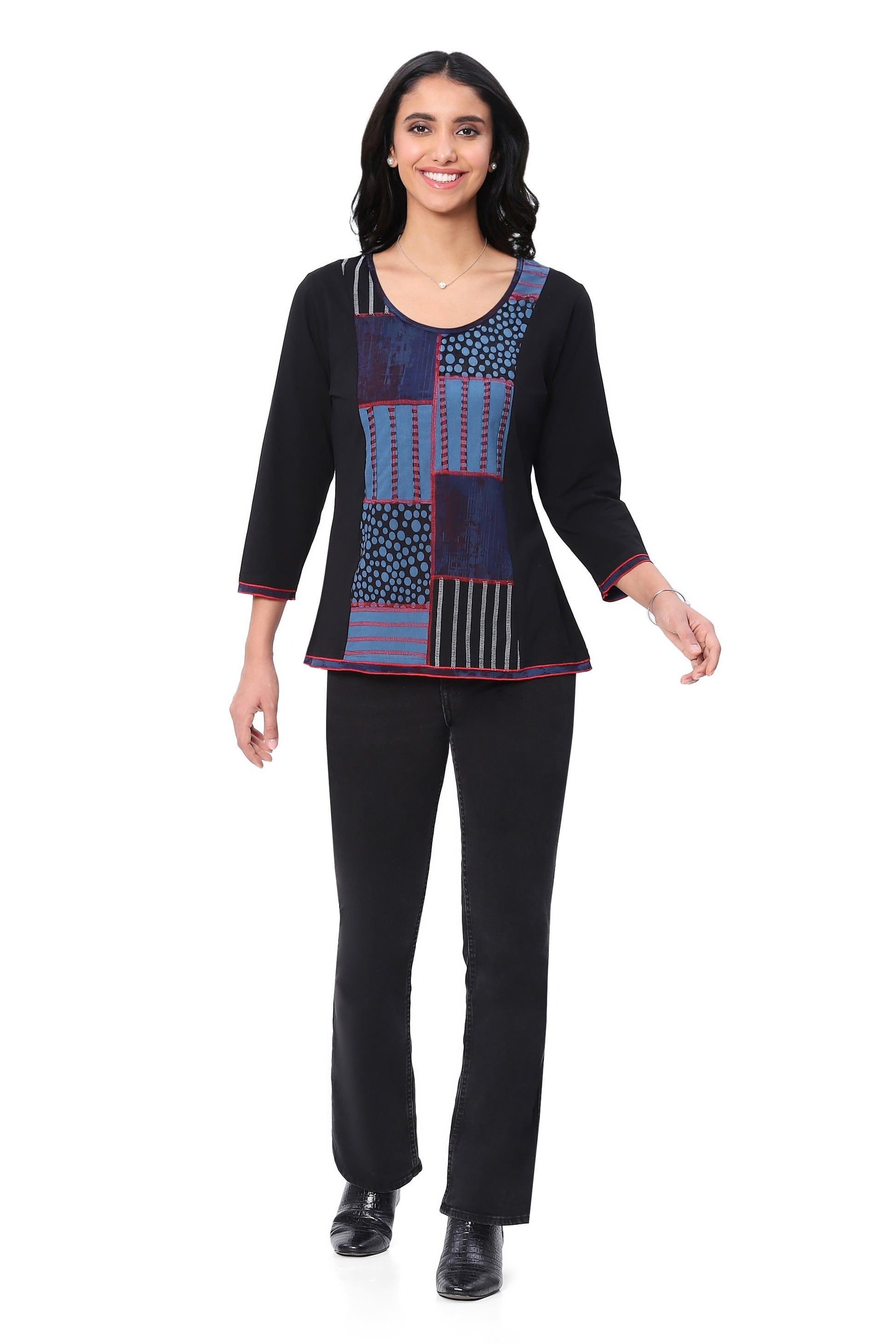 Parsley & Sage Plus Size Top in Black and Blue Ocean hues featuring a pullover design, three-quarter sleeves, and a scoop neckline.
