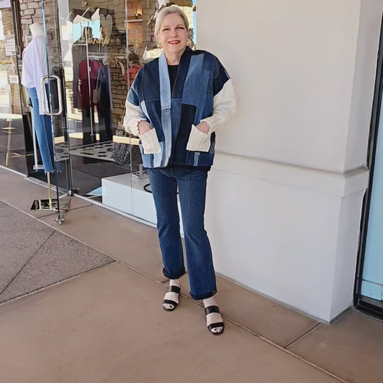 Elevate your wardrobe with this Shannon Passero Joy Jacket, featuring a sophisticated cream and denim colorway. The open-front silhouette and extended sleeves create a versatile layering piece, while functional front pockets add practical appeal. Perfect for transitional seasons and effortless styling.