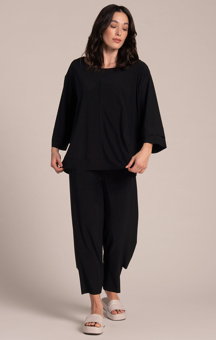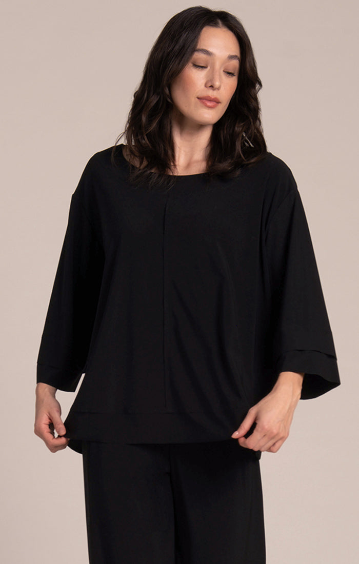 This Sympli Black Splice Double Cuff Top features a Pullover Style, Round Neckline, and 3/4 Wide Sleeve for a versatile and fashionable look.