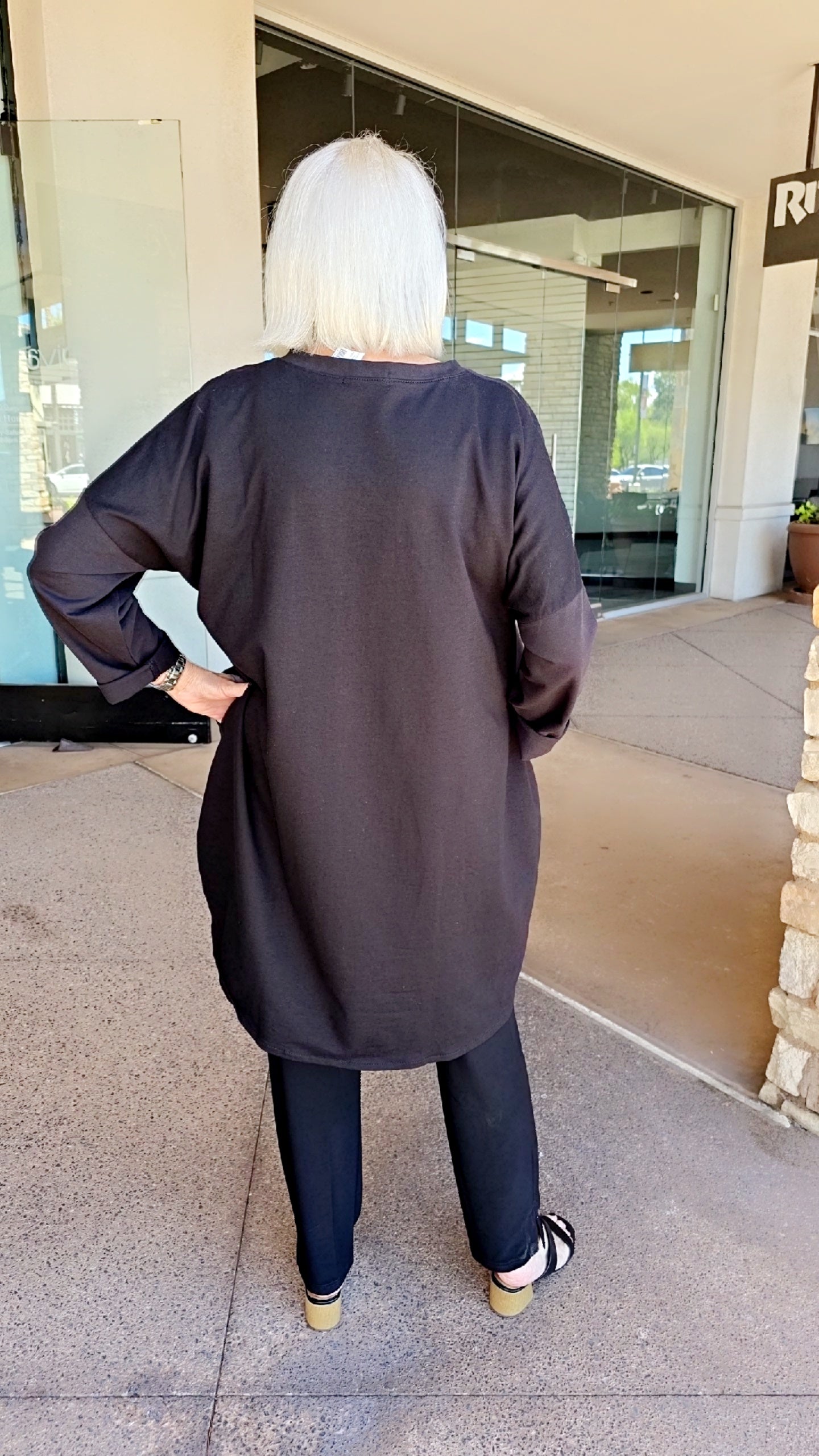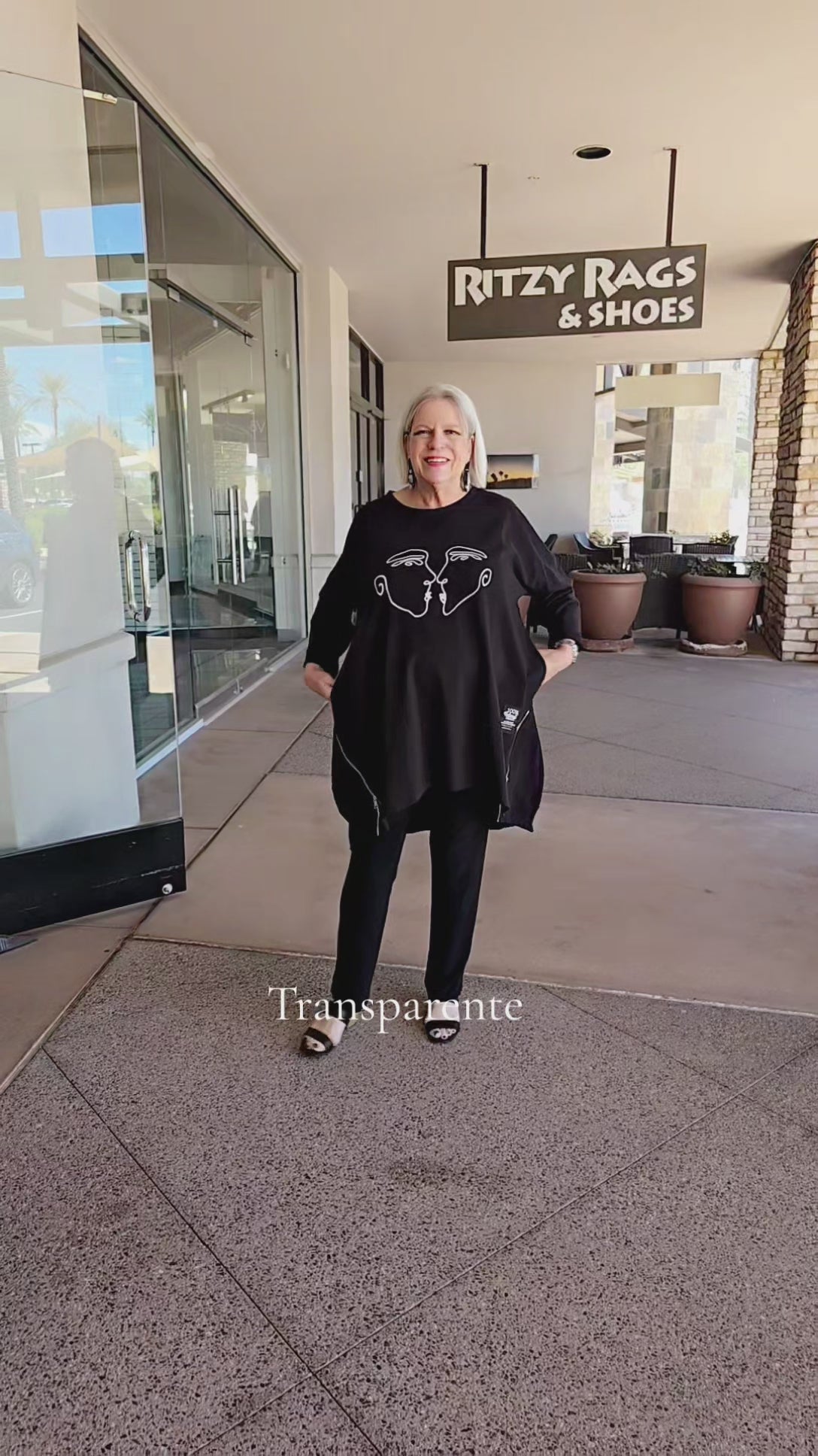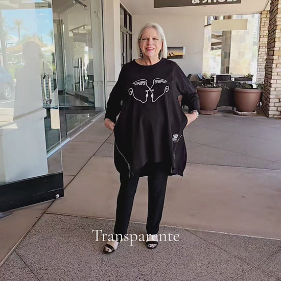 The Transparente Black Face Sweatshirt features a pullover design with a round neckline, long sleeves, a high-low hemline, and a distinctive zipper accent.